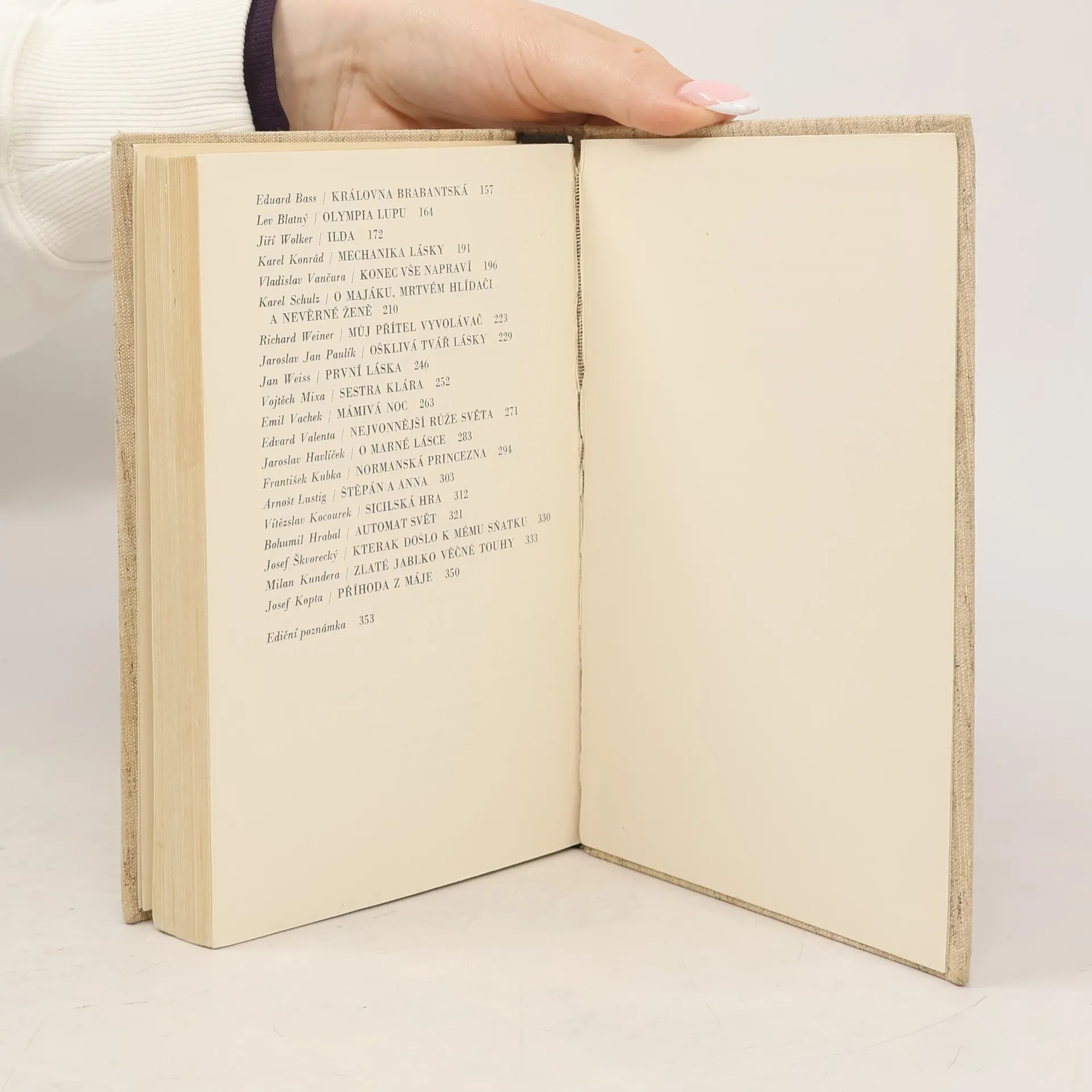 Soubor próz zachycujících mámivost lásky, a to vedle její lákavosti a vábnosti především její šalebnost a zrádnost. Přestože je do výboru zahrnuto několik příběhů starých (legenda o Pirámovi a Tysbě, příběh o jeptišce, vyprávění o Gviškardovi a Sigismundě, odmítnutí panny Alžběty Meziříčské z Lomnice, dopis zamilovaného vojáka z r. 1792), jde jinak o povídky českých autorů od klasiků až po současníky, jsou to: J. K. Tyl, J. Neruda, I. Hermann, A. a V. Mrštíkové, R. Svobodová, A. Sova, J. Mahen, V. Dyk, F. Gellner, J. Uher, O. Theer, J. Hašek, L. Klíma, B. Benešová, M. Majerová, F. Šrámek, F. Langer, K. Čapek, J. Durych, E. Bass, L. Blatný, J. Wolker, K. Konrád, V.Vančura, K. Schulz, R. Weiner, J.J. Paulík, J. Weiss, V. Mixa, E. Vachek, E. Valenta, J. Havlíček, F. Kubka, A. Lustig, V. Kocourek. B. Hrabal, J. Škvorecký, M. Kundera, J. Kopta.