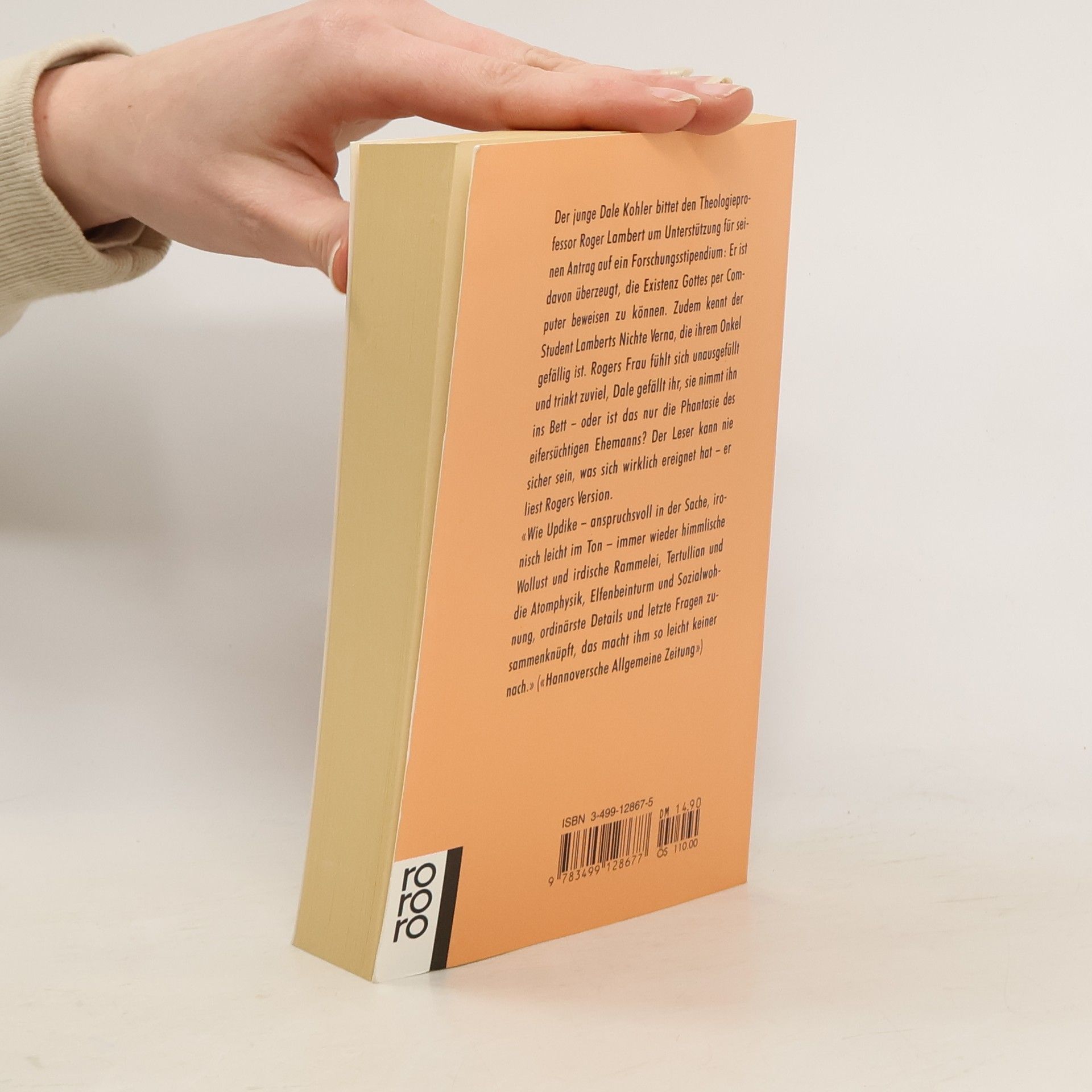 «Updikes frühere Romane über die Erbsünde sind harmlos, verglichen mit dieser feurigen Predigt.» (The Washington Post) Bei Roger Lambert, dem Ich-Erzähler des Buches, Pfeifenraucher, Professor für protestantische Theologie, erscheint eines Tages der Student Dale Kohler - das Computerprogramm DEUS, das er schreiben wird, soll die Existenz Gottes beweisen. Auftritt Esther, Rogers attraktive Frau. Sie hat Probleme, fühlt sich unausgefüllt und trinkt zu viel. Der Student Dale gefällt ihr, sie nimmt ihn ins Bett. Für ihn ist es die große Liebe. Aber geschieht wirklich, was wir in den Liebesstunden der beiden miterleben? Schließlich erzählt der eifersüchtige Ehemann, es ist Rogers Version der Geschichte.