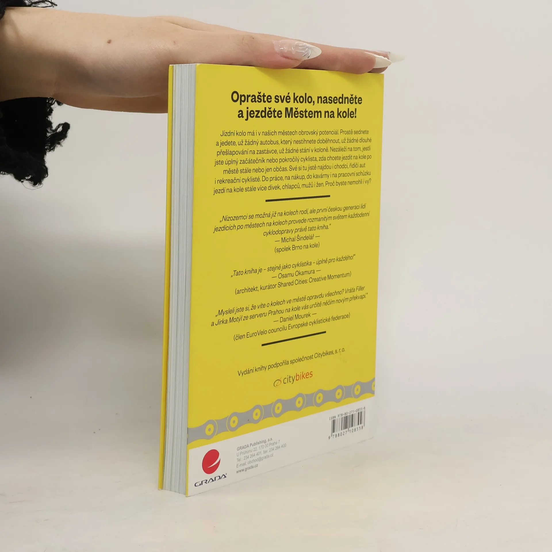 Podtitul: Příručka městského cyklisty. Jízdní kolo má i v našich městech obrovský potenciál. Prostě sednete a jedete, už žádný autobus, který nestihnete doběhnout, už žádné dlouhé přešlapování na zastávce, už žádné popojíždění nebo stání v koloně. Bicykl se stává součástí každodenního života stále většího počtu lidí. Do práce, na nákup, do kavárny i na pracovní schůzku jezdí na kole stále více dívek, chlapců, mužů i žen. Proč byste nemohli i vy?