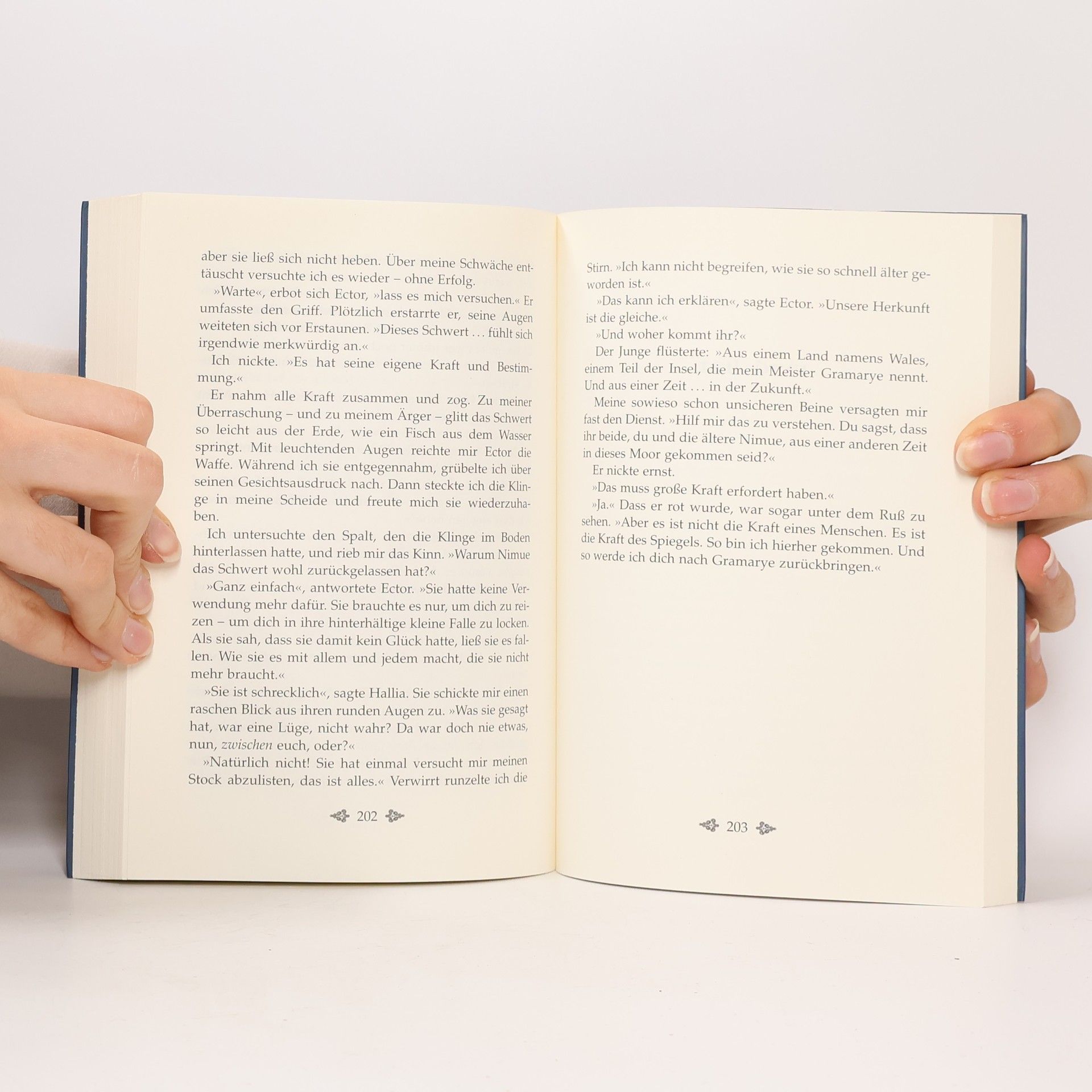 Merlin übt seine Zauberkünste. Ein misslungener Springzauber versetzt ihn und Hallia ins verhexte Moor, wo Merlins Schwert von einem Vogel entführt wird. Bei ihrer Suche treffen sie auf einen jungen Mann, Ector. Merlin droht der tödlichen Verletzung eines Killerkäfers zu erliegen. Heilung kann nur der magische Schlüssel bringen, eines der sieben weisen Werkzeuge Fincayras. Als sie ihn nach zahllosen Abenteuern gefunden haben, erscheint Merlins alte Gegenspielerin Nimue: Schlüssel gegen Schwert, lautet ihr Angebot. Merlin setzt den Schlüssel jedoch ein, um den Zauber zu brechen, den sie über die Moorghule verhängt hat. Das Schwert steckt fest in einem Stein, nur Ector kann es herauszuziehen. Er gesteht, dass er aus einer anderen Zeit stammt, und verspricht, Merlin durch den Zeitspiegel nach Gramarye zu seinem Meister zu bringen, der ihn wird heilen können. Die wallenden Zeitnebel bringen sie zu Ectors Meister, der zu Merlins Verblüffung denselben Namen trägt wie er: Merlin steht sich selbst gegenüber! Und Ectors richtiger Name ist Artus … Ein Festmahl zu dritt krönt das ungewöhnliche Zusammentreffen. Auf dem Weg zurück durch die Zeitnebel wird Merlin klar, dass sein wahres Bild in ihm selbst liegt. Er hat den »Spiegel, der kein Licht braucht« entdeckt. Auch der vierte Teil der Merlin-Saga ist voller Leidenschaft und Tiefgründigkeit und bereichert die Legende um eine faszinierende neue Dimension.
