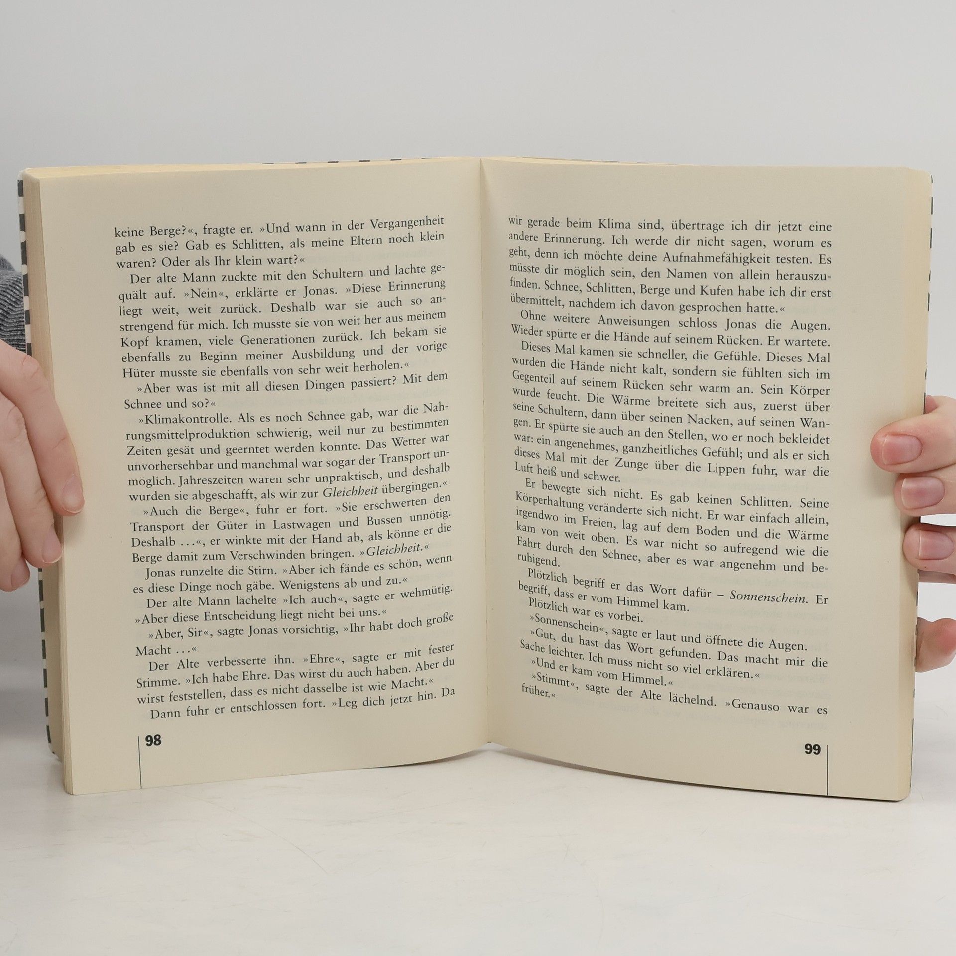 Jonas lebt in einer Welt, in der es keine Kriege mehr gibt, keine Verbrechen und keine Angst mehr. Jeder lebt wohlbehütet ein bis ins kleinste geregeltes Leben. Alle sind glücklich und zufrieden. Nun lernt Jonas im Zuge seiner Ausbildung zum "Hüter der Erinnerung" die Lebensform seiner Vorfahren kennen, hört von Tod, Gewalt, Schmerz, aber auch von Freundschaft und Liebe. Plötzlich hat er Zweifel, ob die Entscheidung, Selbstbestimmung, Freiheit und Gefühle zugunsten von Sicherheit, Zweckmäßigkeit und Schmerzfreiheit aufzugeben, richtig war... Eine äußerst spannende Zukunftsvision.