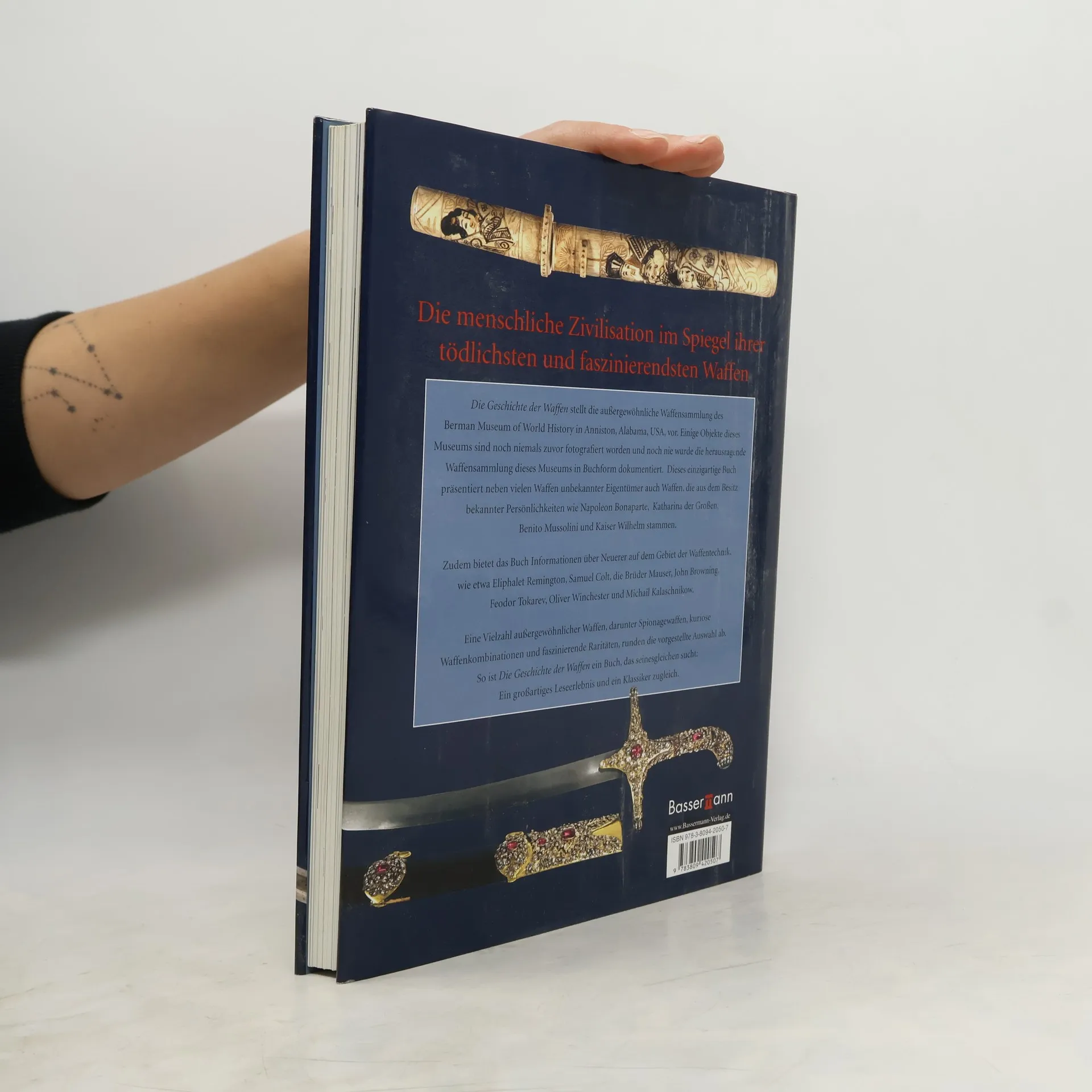 Die Geschichte der Waffen stellt die außergewöhnliche Waffensammlung des Berman Museum of World History in Anniston, Alabama, USA, vor. Einige Objekte dieses Museums sind noch niemals zuvor fotografiert worden und noch nie wurde die herausragende Waffensammlung dieses Museums in Buchform dokumentiert. Dieses einzigartige Buch präsentiert neben vielen Waffen unbekannter Eigentümer auch Waffen, die aus dem Besitz bekannter Persönlichkeiten wie Napoleon Bonaparte, Katharina der Großen, Benito Mussolini und Kaiser Wilhelm stammen. Eine Vielzahl außergewöhnlicher Waffen, darunter Spionagewaffen und kuriose Waffenkombinationen, runden die vorgestellte Auswahl ab.
