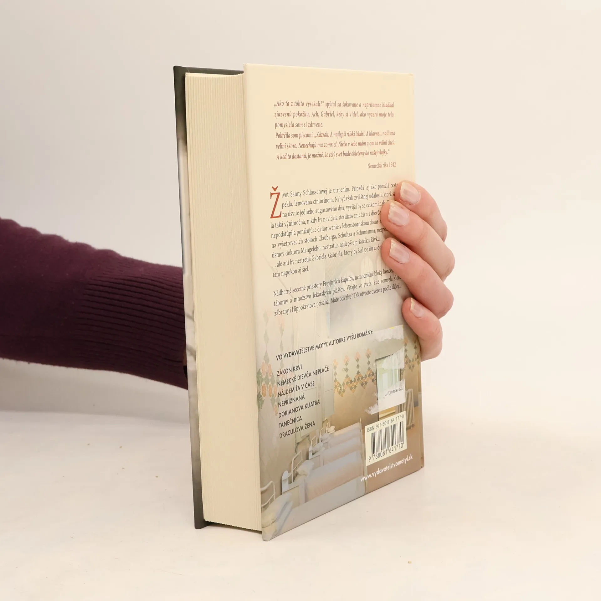 „Ako ťa z tohto vysekali?" spýtal sa šokovane a neprítomne hladkal zjazvenú pokožku. Ach, Gabriel, keby si videl, ako vyzerá moje telo - pomyslela som si zdrvene. Pokrčila som plecami. „Zázrak. A najlepší ríšski lekári. A hlavne... našli ma veľmi skoro. Nenechajú ma zomrieť. Niečo v sebe mám a oni to veľmi chcú. A keď to dostanú je možné, že celý svet bude oblečený do našej vlajky," Nemecká ríša, 1942 Život Sanny Schlosserovej je utrpením. Pripadá jej ako pomalá cesta do pekla, lemovaná cintorínom. Nebyť však podivnej udalosti, ktorá sa stala na úsvite jedného augustového dňa, vyvíjal by sa celkom inak. Keby nie jej náhlej výnimočnosti, nikdy by nevidela sterilizovanie žien a dievčat v Osvienčime, nepodstúpila ponižujúce deflorovanie v lebensbornskom dome, neokúsila bolesť na vyšetrovacích stoloch Clauberga, Schultza a Schumanna, nespoznala desivý úsmev doktora Mengeleho, nestratila najlepšiu priateľku Rivku... ... ale ani by nestretla Gabriela. Gabriela, ktorý by šiel po ňu aj do pekla. A možno tam napokon aj šiel. Nádherné secesné priestory Freyjiných kúpeľov, nemocničné bloky koncentračných táborov a množstvo lekárskych plášťov. Vitajte vo svete, kde zomrela sloboda, zábrany i Hippokratova prísaha. Máte odvahu? Tak otvorte dvere a poďte ďalej...
