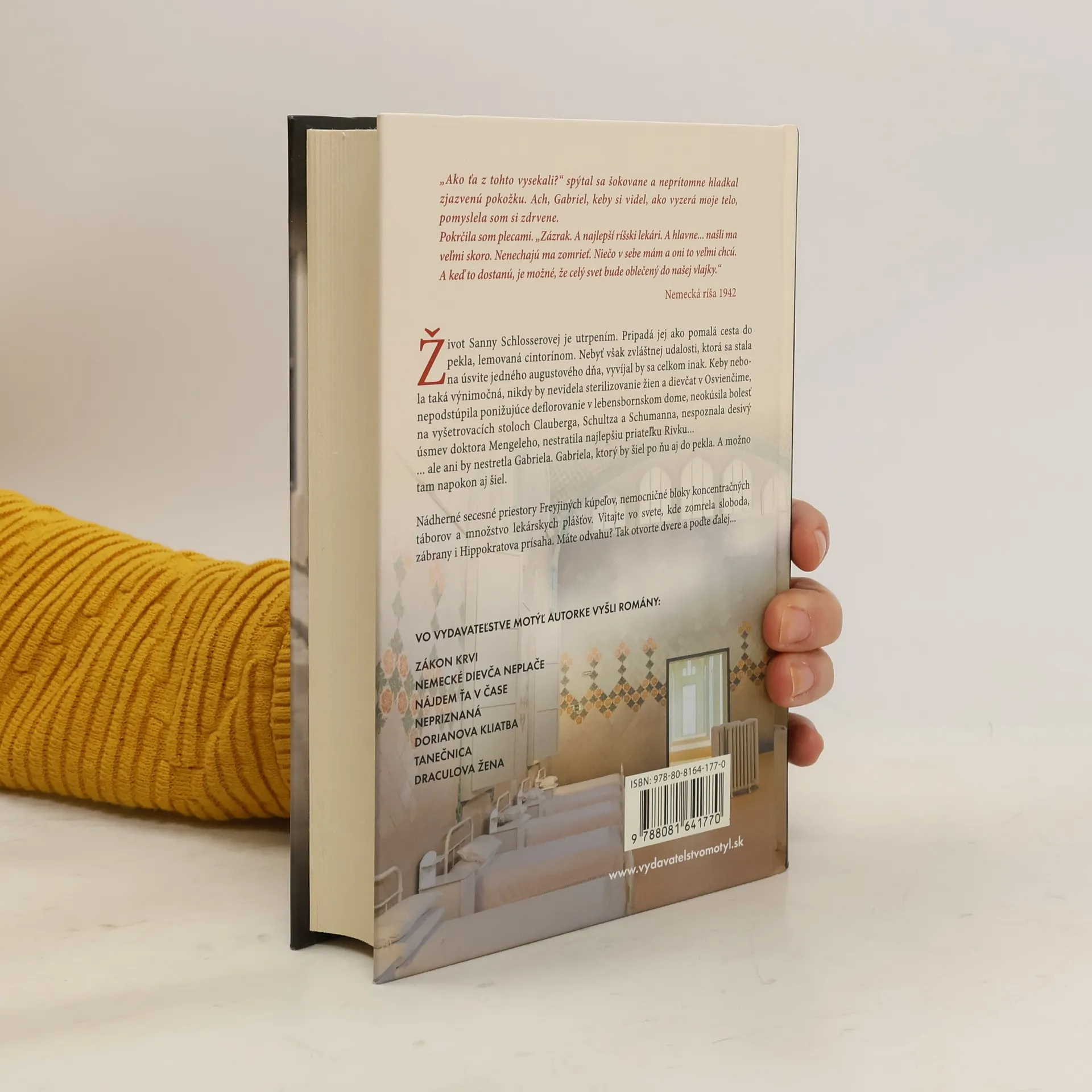 „Ako ťa z tohto vysekali?" spýtal sa šokovane a neprítomne hladkal zjazvenú pokožku. Ach, Gabriel, keby si videl, ako vyzerá moje telo - pomyslela som si zdrvene. Pokrčila som plecami. „Zázrak. A najlepší ríšski lekári. A hlavne... našli ma veľmi skoro. Nenechajú ma zomrieť. Niečo v sebe mám a oni to veľmi chcú. A keď to dostanú je možné, že celý svet bude oblečený do našej vlajky," Nemecká ríša, 1942 Život Sanny Schlosserovej je utrpením. Pripadá jej ako pomalá cesta do pekla, lemovaná cintorínom. Nebyť však podivnej udalosti, ktorá sa stala na úsvite jedného augustového dňa, vyvíjal by sa celkom inak. Keby nie jej náhlej výnimočnosti, nikdy by nevidela sterilizovanie žien a dievčat v Osvienčime, nepodstúpila ponižujúce deflorovanie v lebensbornskom dome, neokúsila bolesť na vyšetrovacích stoloch Clauberga, Schultza a Schumanna, nespoznala desivý úsmev doktora Mengeleho, nestratila najlepšiu priateľku Rivku... ... ale ani by nestretla Gabriela. Gabriela, ktorý by šiel po ňu aj do pekla. A možno tam napokon aj šiel. Nádherné secesné priestory Freyjiných kúpeľov, nemocničné bloky koncentračných táborov a množstvo lekárskych plášťov. Vitajte vo svete, kde zomrela sloboda, zábrany i Hippokratova prísaha. Máte odvahu? Tak otvorte dvere a poďte ďalej...
