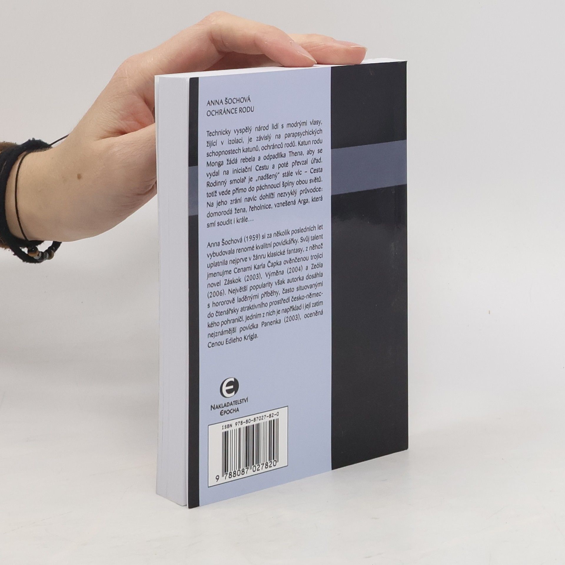 Technicky vyspělý národ lidí s modrými vlasy, žijící v izolaci, je závislý na parapsychických schopnostech katunů, ochránců rodů. Katun rodu Monga žádá rebela a odpadlíka Thena, aby se vydal na iniciační Cestu a poté převzal úřad. Rodinný smolař je „nadšený“ stále víc – Cesta totiž vede přímo do páchnoucí špíny obou světů. Na jeho zrání navíc dohlíží nezvyklý průvodce: Domorodá žena, řeholnice, vznešená Arga, která smí soudit i krále… Anna Šochová (1959) si za několik posledních let vybudovala renomé kvalitní povídkářky. Svůj talent uplatnila nejprve v žánru klasické fantasy, z něhož jmenujme Cenami Karla Čapka ověnčenou trojici novel Záskok (2003), Výměna (2004) a Zeóla (2006). Největší popularity však autorka dosáhla s hororově laděnými příběhy, často situovanými do čtenářsky atraktivního prostředí česko-německého pohraničí. Jedním z nich je například i její zatím nejznámější povídka Panenka (2003), oceněná Cenou Edieho Krígla