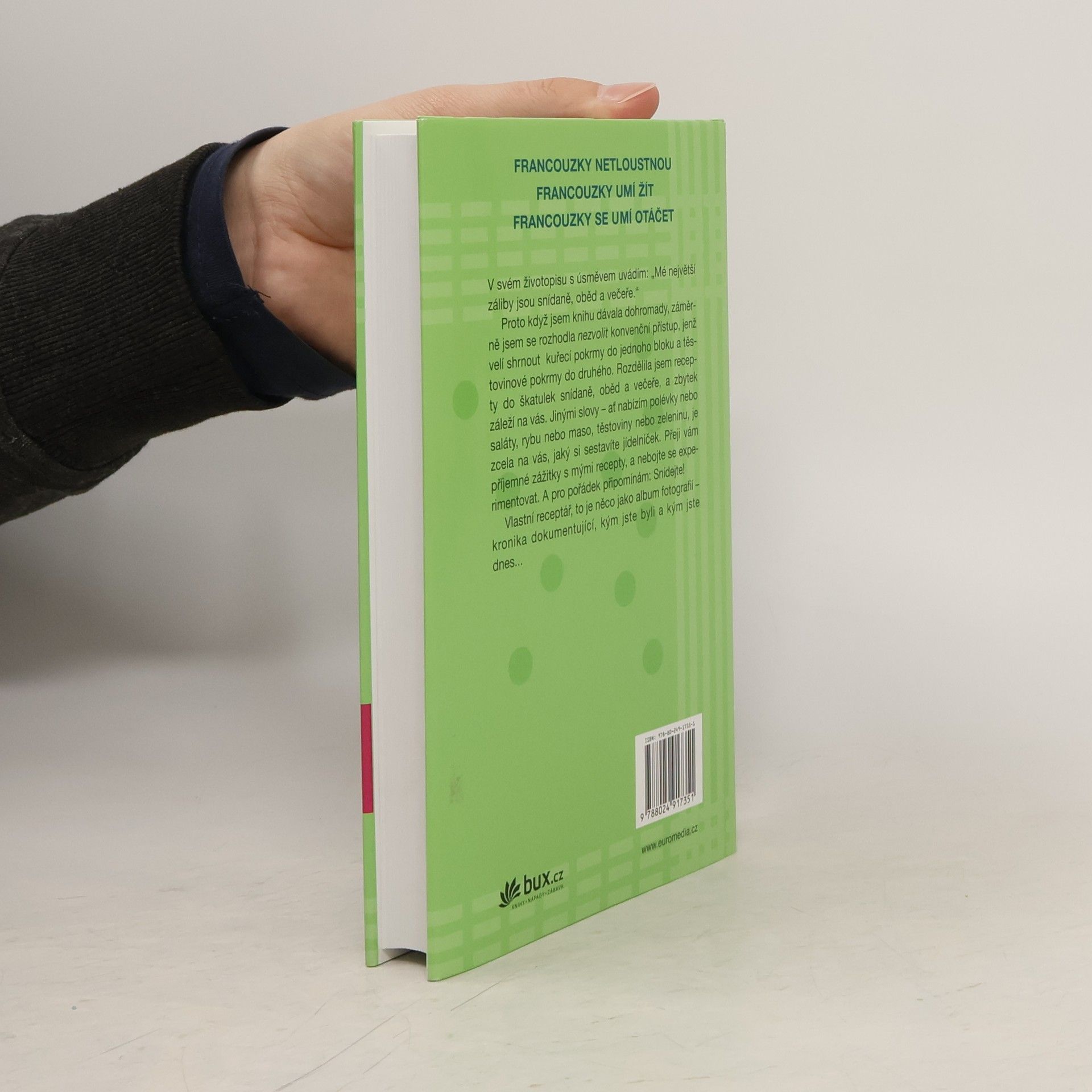 Knihy francouzské podnikatelky žijící ve Spojených státech Francouzky netloustnou a její dvě pokračování se staly bezesporu bestsellery. Mireille jednoho dne odjela jako mladá štíhlá studentka do Spojených států a po několika semestrech se vrátila do Francie s nadváhou. Díky rodinnému lékaři se jí brzy podařilo vrátit k původnímu stylu života - a také vzhledu. Autorka na vlastní zkušenosti odkryla tajemství francouzského paradoxu, který spočívá v tom, že právě Francouzky, jež jsou známé svým požitkářstvím, zůstávají až do vysokého věku štíhlé a vitální. Čtenářky nenechaly Mireille v klidu. Dychtily vědět, jak se opravdu stravuje, jak jídla připravuje a jaká jsou její dietní tajemství. Proto Mireille sestavila kuchařskou knihu - netradiční, zajímavou a inspirující. Předkládá vlastní interpretaci pokrmů, na nichž si léta pochutnávala s rodinou a přáteli, a také zbrusu nové „objevy“. Zařadila sem i malou kolekci osvědčených stálic a několik čtenáři vychválených receptů, které zazářily v předchozích knihách. Autorka věří v jednoduché recepty zachovávající ryzí chutě. Má ráda rozmanitost, jíž dociluje nakupováním čerstvého zboží na trhu. Zvlášť miluje pokrmy přinášející smyslový požitek, promlouvající ke zraku, čichu, chuti i hmatu. Z receptů se musí zrodit jídlo, které dobře chutná. Vše se točí kolem potěšení a zdraví. Uvidíte sami.