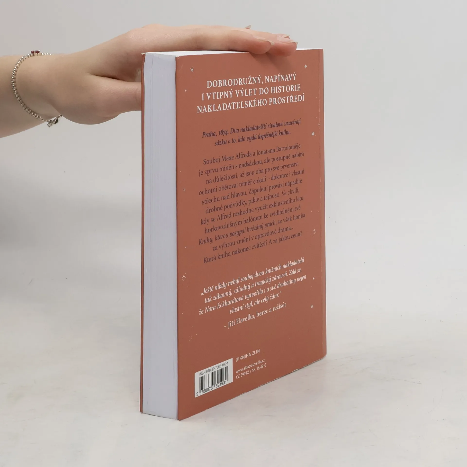 Dobrodružný, napínavý i vtipný výlet do historie nakladatelského prostředí.Praha, 1874. Dva nakladatelští rivalové uzavírají sázku o to, kdo vydá úspěšnější knihu. Souboj Maxe Alfreda a Jonatana Bartoloměje je zprvu míněn s nadsázkou, ale postupně nabírá na důležitosti, až jsou oba pro své prvenství ochotní obětovat téměř cokoli – i střechu nad hlavou. Zápolení provází drobné podvůdky, pikle a tajnosti. Ve chvíli, kdy se Alfred rozhodne využít exklusivního letu balónem ke zviditelnění své „Knihy, kterou posypal hvězdný prach“, se však honba za výhrou mění v opravdové drama…