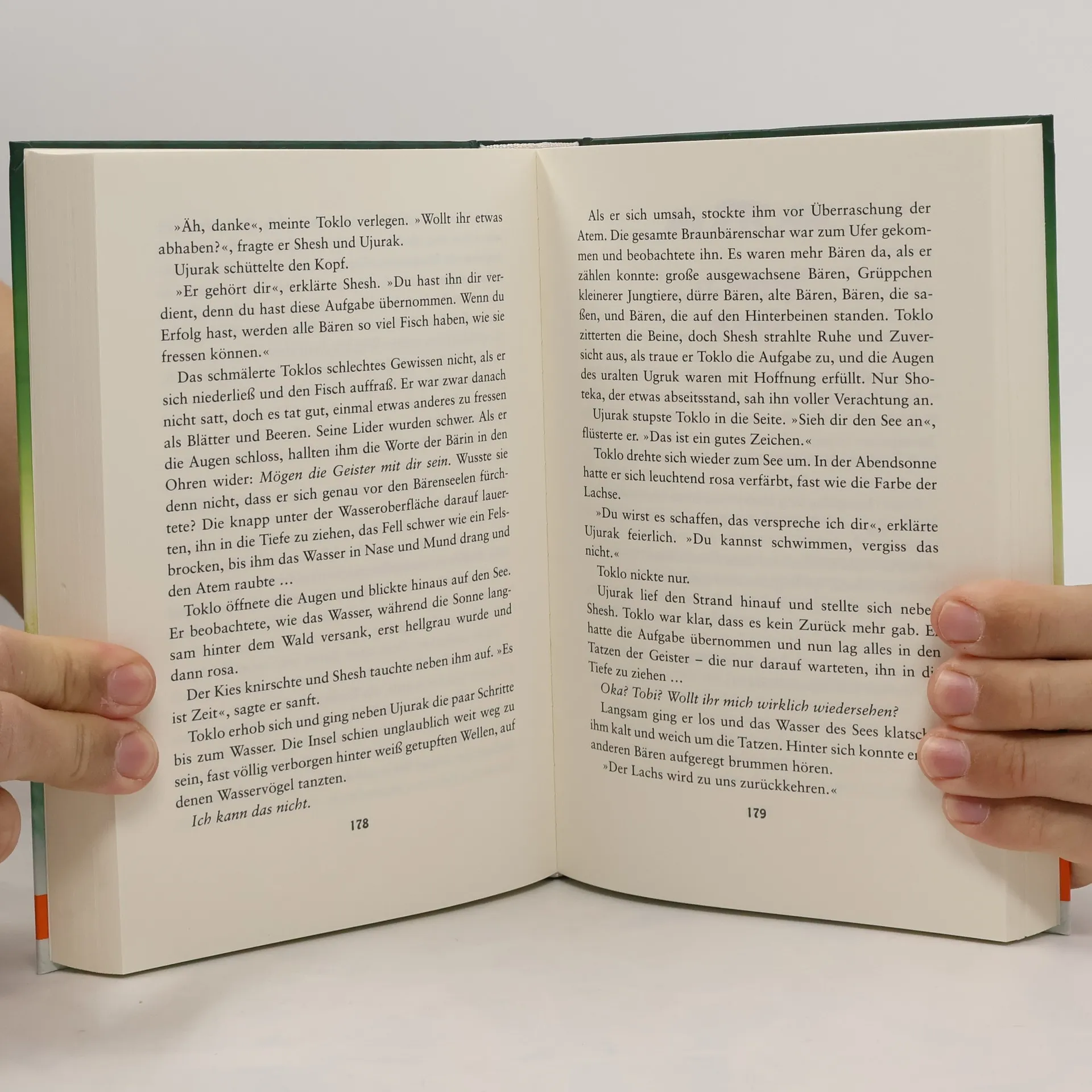 Toklo spürte, wie die Bärengeister an seinen Tatzen zerrten, ihn ins Wasser zogen, und er meinte, die Stimmen Tobis und seiner Mutter zu hören. Komm zu uns, flüsterten sie. Komm ins Wasser... Der Grizzly Toklo ist mit seinen neuen Gefährten Ujurak und Lusa endlich am Großen Bärensee angekommen. Dort versammeln sich zum Längsten Tag unzählige Braunbären, Schwarzbären und Eisbären, um die Geister gnädig zu stimmen. Auch die junge Eisbärin Kallik zieht es zum See in der Hoffnung, endlich ihren Bruder zu finden. Doch zwischen all den ausgewachsenen Bären ist kein Platz für Junge ohne Schutz. Es herrschen Unruhe und Feindseligkeit. In ihrem erbitterten Kampf ums Überleben scheinen die Bären vor nichts mehr zurückzuschrecken. Toklo, Lusa, Ujurak und Kallik geraten in große Gefahr ...