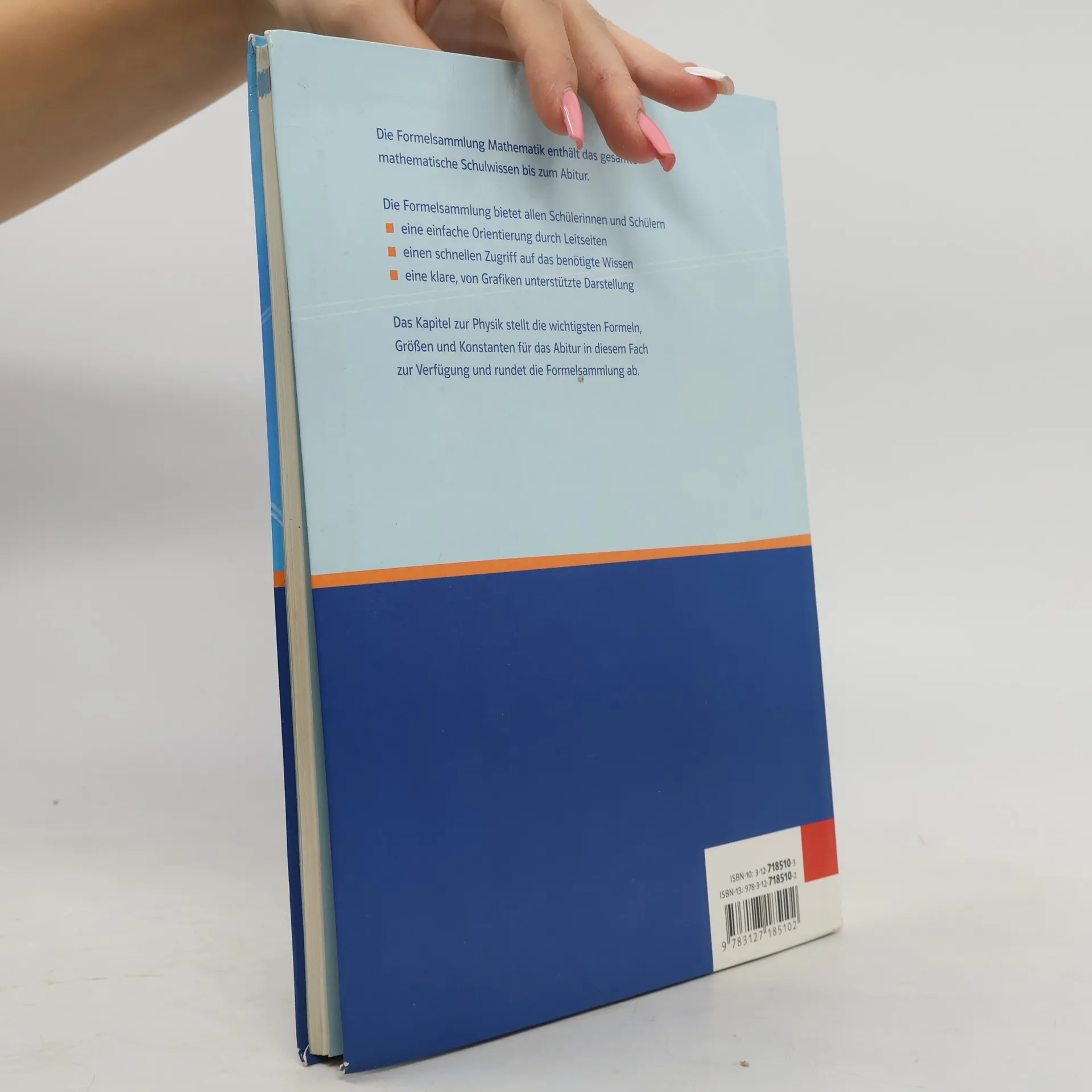 NEU: Jetzt mit beigelegter Merkhilfe für Baden-Württemberg (zugelassen für die Abiturprüfung ab 2017!) Übersichtlich zusammengestellt finden Sie in dieser neuen Formelsammlung für Gymnasien alle Formeln und Grundbegriffe, die Ihre Schülerinnen und Schüler bis zum Abitur benötigen. Die Pluspunkte auf einen Blick: schneller Zugriff auf drei möglichen Wegen: Inhaltsverzeichnis, Leitseiten oder Register, die Leitseiten bieten einen Überblick über den Themenbereich und ermöglichen das schnelle Auffinden relevanter Inhalte, die Inhalte werden durch Grafiken erläutert und verdeutlicht, Querverweise vernetzen die Teilgebiete sinnvoll miteinander, ausführliches, problemorientiertes Register in schülerverständlicher Sprache, ein zusätzliches Kapitel mit Formeln und Grundbegriffen aus der Physik, deckt die neuen Bildungsstandards ab, komplett vierfarbig. Die Formelsammlung wurde von der Stiftung Buchkunst als eines der schönsten deutschen Bücher prämiert!