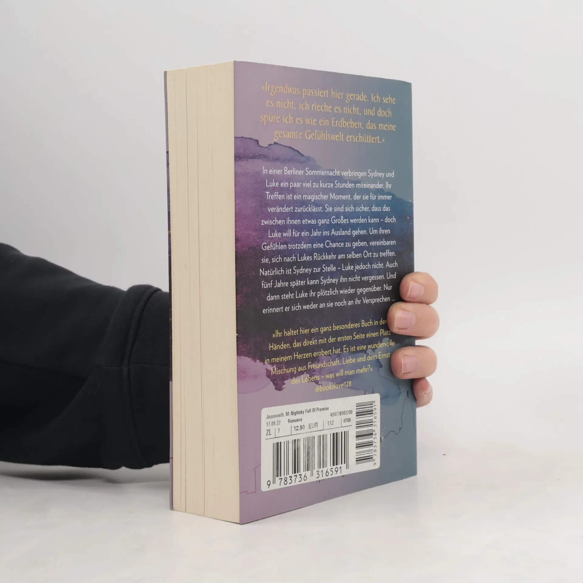 „Irgendwas passiert hier gerade. Ich sehe es nicht, ich rieche es nicht, und doch spüre ich es wie ein Erdbeben, das meine gesamte Gefühlswelt erschüttert.“ In einer Berliner Sommernacht verbringen Sydney und Luke ein paar viel zu kurze Stunden miteinander. Ihr Treffen ist ein magischer Moment, der sie für immer verändert zurücklässt. Sie sind sich sicher, dass das zwischen ihnen etwas ganz Großes werden kann - doch Luke will für ein Jahr ins Ausland gehen. Um ihren Gefühlen trotzdem eine Chance zu geben, vereinbaren sie, sich nach Lukes Rückkehr am selben Ort zu treffen. Natürlich ist Sydney zur Stelle - Luke jedoch nicht. Auch fünf Jahre später kann Sydney ihn nicht vergessen. Und dann steht Luke ihr plötzlich wieder gegenüber. Nur erinnert er sich weder an sie noch an ihr Versprechen ... „Ihr haltet hier ein ganz besonderes Buch in den Händen, das direkt mit der ersten Seite einen Platz in meinem Herzen erobert hat. Es ist eine wundervolle Mischung aus Freundschaft, Liebe und dem Ernst des Lebens - was will man mehr?“ @BOOKSLOVE128 Erster Band der BERLIN -NIGHT- Trilogie