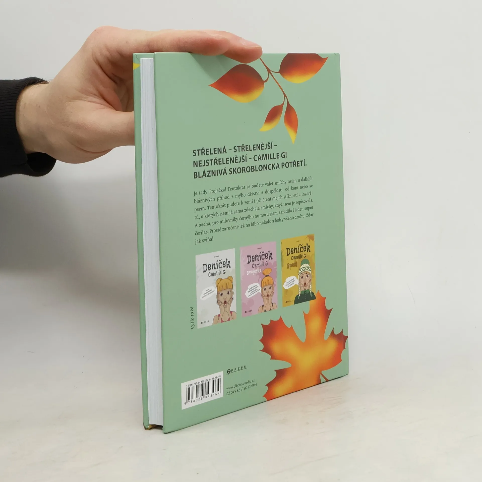 Střelená – střelenější – nejstřelenější – Camille G! Bláznivá skorobloncka potřetí.Je tady Troječka! Tentokrát se budete válet smíchy nejen u dalších bláznivých příhod z mýho dětství a dospělosti, od koní nebo se psem. Tentokrát pudete k zemi i při čtení mejch stížností a inzerátů, u kterých jsem já sama zdechala smíchy, když jsem je sepisovala. A bacha, pro milovníky černýho humoru jsem zařadila i jeden super čerňas. Prostě zaručené lék na blbó náladu a fedry všeho druhu. Zdar jak sviňa!