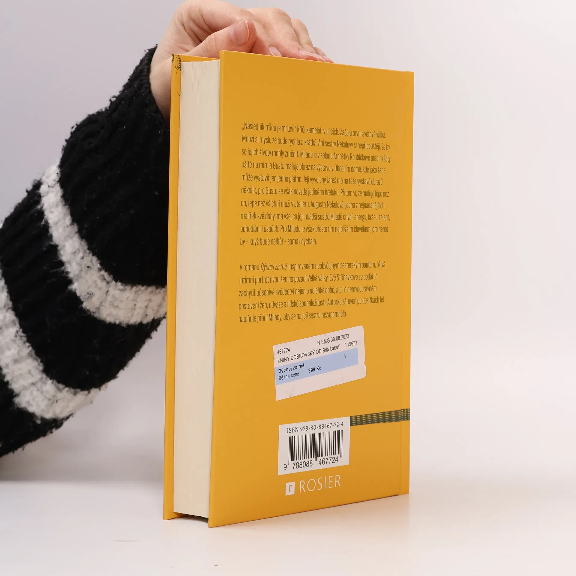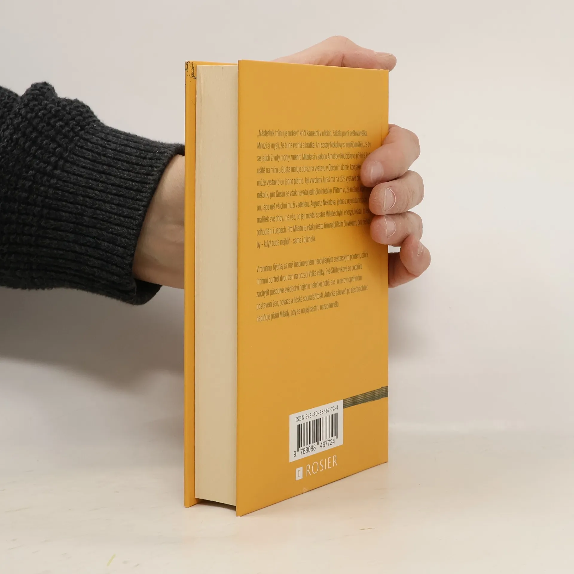 Podle skutečného příběhu české malířky, jejíž talent byl zastíněn válkou . „Následník trůnu je mrtev!“ křičí kameloti v ulicích. Začala první světová válka. Mnozí si myslí, že bude rychlá a krátká. Ani sestry Nekolovy si nepřipouštějí, že by se jejich životy mohly změnit. Milada si v salonu Arnoštky Roubíčkové přebírá šaty ušité na míru a Gusta maluje obraz na výstavu v Obecním domě, kde jako žena může vystavit jen jedno plátno. Její vyvolený Jareš má na téže výstavě obrazů několik, pro Gustu se však nevzdá jediného hřebíku. Přitom ví, že maluje lépe než on, lépe než všichni muži v ateliéru. Augusta Nekolová, jedna z nejnadanějších malířek své doby, má vše, co její mladší sestře Miladě chybí: energii, krásu, talent, odhodlání i úspěch. Pro Miladu je však přesto tím nejbližším člověkem, pro něhož by – když bude nejhůř – sama i dýchala. V románu Dýchej za mě, inspirovaném neobyčejným sesterským poutem, ožívá intimní portrét dvou žen na pozadí Velké války. Evě Střihavkové se podařilo zachytit působivé svědectví nejen o nelehké době, ale i o nerovnoprávném postavení žen, odvaze a lidské sounáležitosti. Autorka zároveň po desítkách let naplňuje přání Milady, aby se na její sestru nezapomnělo.