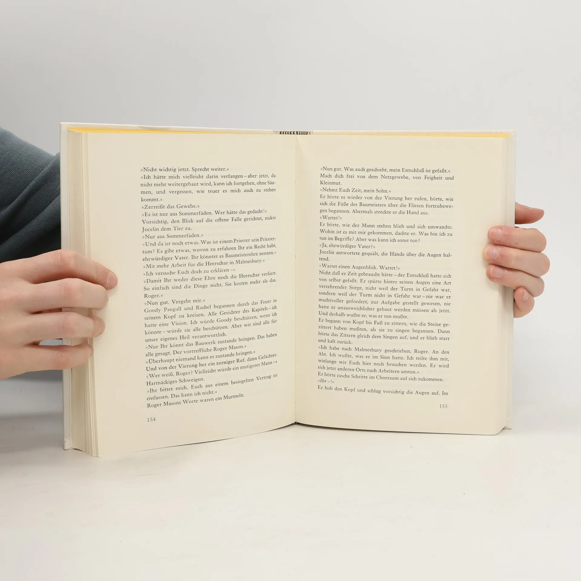 Jocelin, der Dekan der seit einhundertfünfzig Jahren stehenden Münsterkirche der Jungfrau Maria, hält sich für ausersehen, einen neuen, 400 Fuß hohen Turm errichten zu lassen. Der Sakristan Pater Anselm, die anderen Geistlichen, der Kirchendiener Pangall und die Bewohner der Stadt halten Jocelin für verrückt, aber der Dekan beauftragt den Baumeister Roger Mason mit dem Werk. Dessen Arbeiter graben zuerst den Boden unter der Vierung auf, damit Roger nach den Fundamenten sehen kann. Die hält er für viel zu instabil, um einen so hohen Turm tragen zu können, aber Jocelin lässt sich nicht von seinem Vorhaben abbringen. Also öffnet Roger das Gewölbe über der Vierung und beginnt mit dem Bau eines neuen Turmes. Die Messe wird nun statt am Hauptaltar in einer seitlich gelegenen Marienkapelle gelesen. Als in dem Loch unter der Vierung der Boden abrutscht und Steine von der Decke fallen, ist Roger froh, denn er nimmt an, dass damit die Entscheidung gegen einen Weiterbau gefallen sei. Er hat nicht mit Jocelins Starrsinn gerechnet, der sich eigens mit dem Abt von Malmesbury in Verbindung setzte, um zu verhindern, dass dieser Roger Mason einen anderen Bauauftrag erteilte. Von einer Einstellung der Arbeiten will Jocelin nichts wissen; er ist nicht einmal bereit, sich mit einer geringeren Turmhöhe zufrieden zu geben.