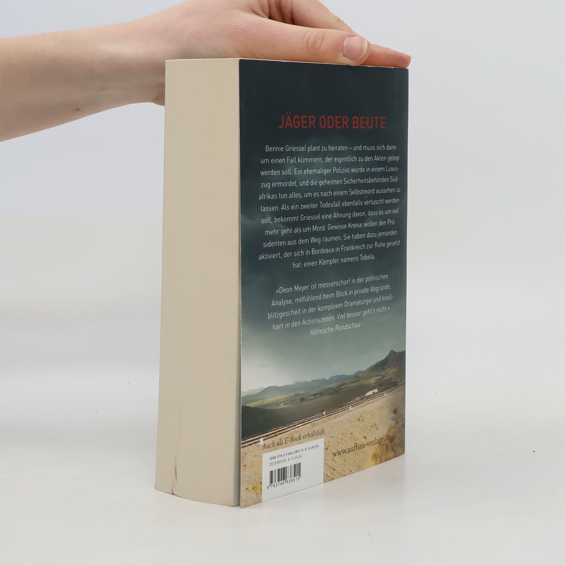 Jäger oder Beute. Bennie Griessel plant zu heiraten – und muss sich dann um einen Fall kümmern, der eigentlich zu den Akten gelegt soll. Ein ehemaliger Polizist wurde in einem Luxuszug ermordet, und die geheimen Sicherheitsbehörden Südafrikas tun alles, um es nach einem Selbstmord aussehen zu lassen. Als ein zweiter Todesfall ebenfalls vertuscht werden soll, bekommt Griessel eine Ahnung davon, dass es um viel mehr geht als um Mord. Gewisse Kreise wollen den Präsidenten aus dem Weg räumen. Sie haben dazu jemanden aktiviert, der sich in Bordeaux in Frankreich zur Ruhe gesetzt hat: einen Kämpfer namens Tobela. „Deon Meyer ist messerscharf in der politischen Analyse, mitfühlend beim Blick in private Abgründe, blitzgescheit in der komplexen Dramaturgie und knallhart in den Actionszenen. Viel besser geht's nicht.“ Kölnische Rundschau