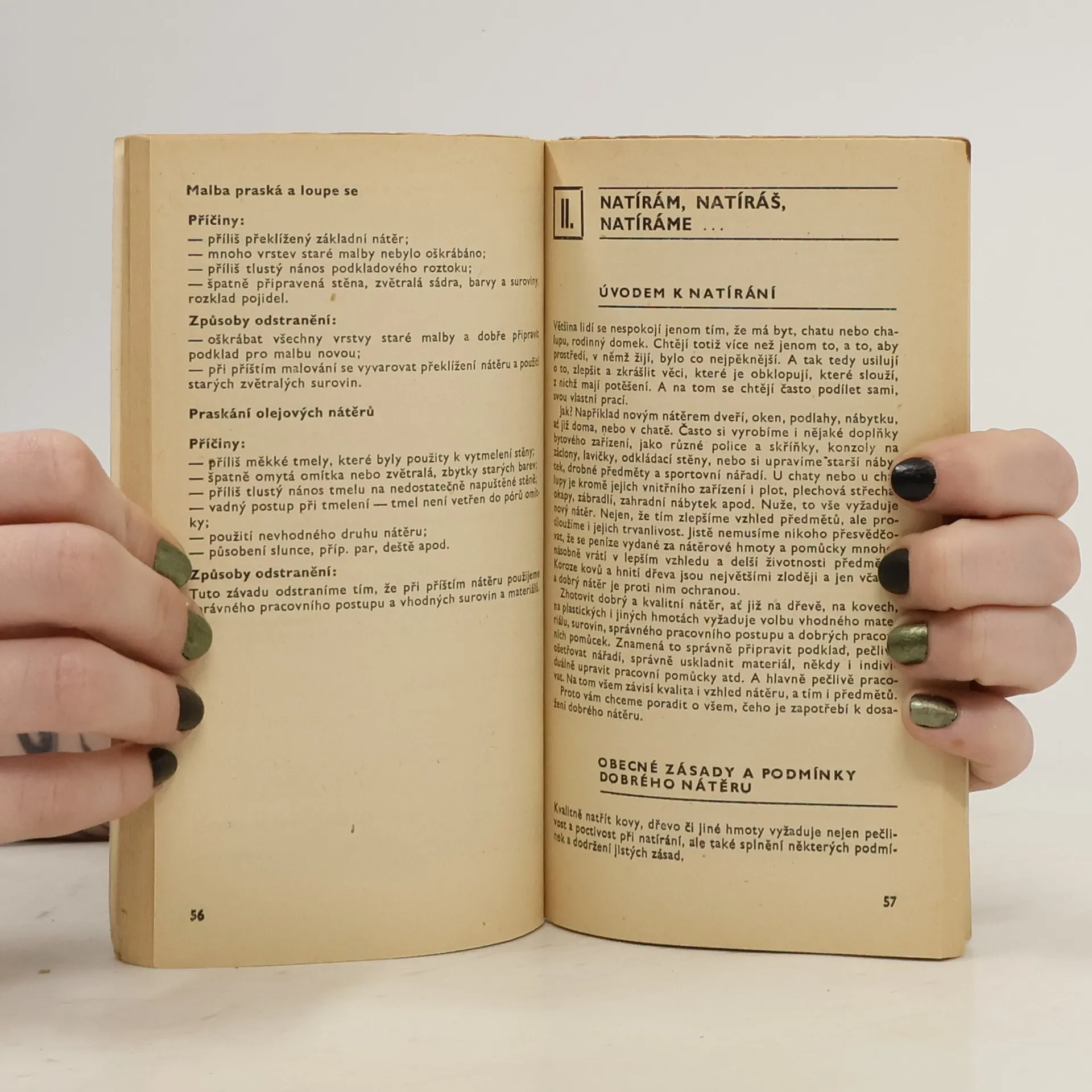 Praktická příručka obsahuje základní a srozumitelné informace o všem, co se týká malování a natírání. Popisuje potřebné náčiní a pomůcky, radí, jak volit a kombinovat barvy a informuje rovněž o běžných i speciálních malířských technikách. Seznamuje zejména se správným pracovnímpostupem a materiálem při natírání dřeva, kovů, plastických i jiných hmot. Na konci je připojen přehled potřeb k natírání a malování se stručnou charakteristikou, pro jaký předmět je příslušná nátěrová hmota nejvhodnější.