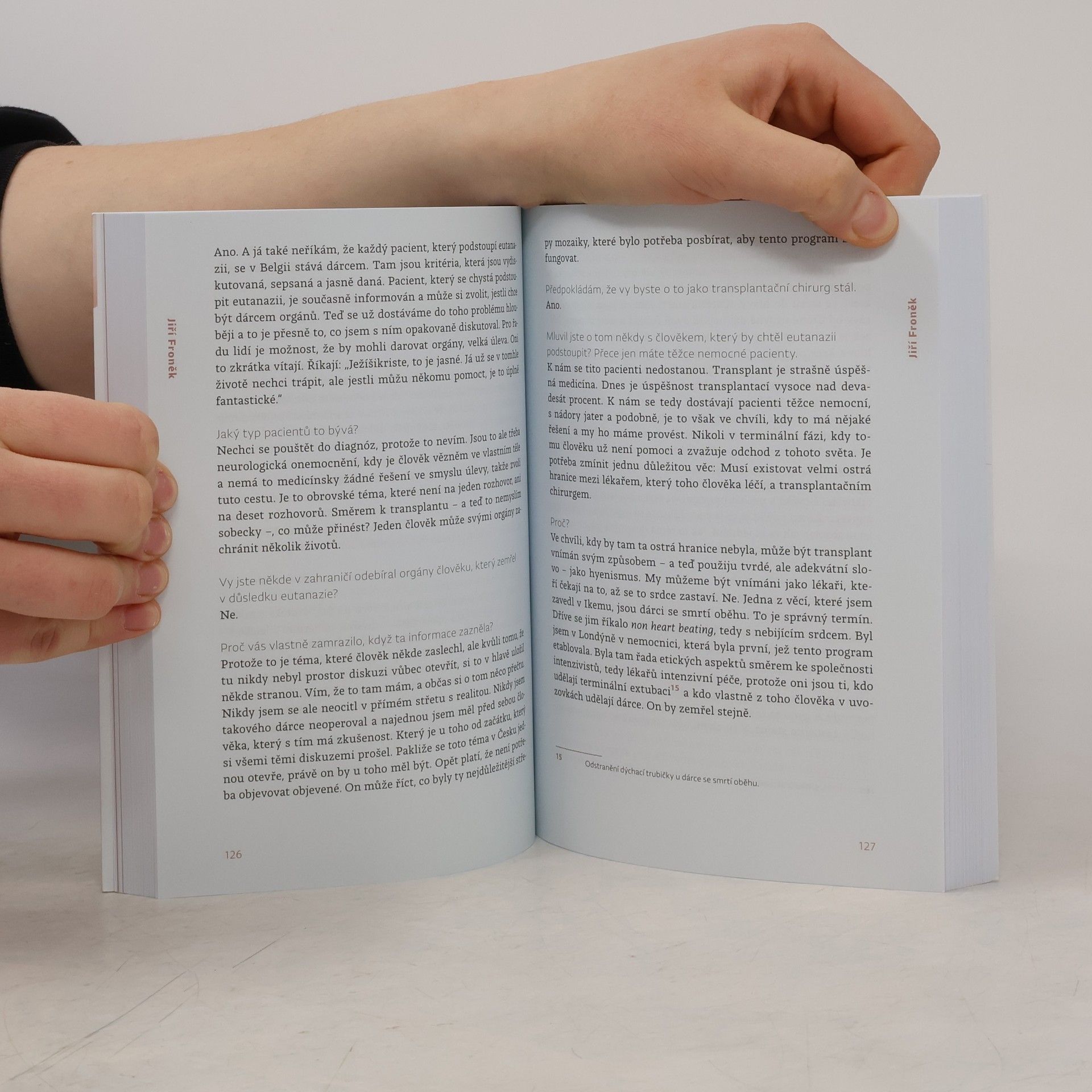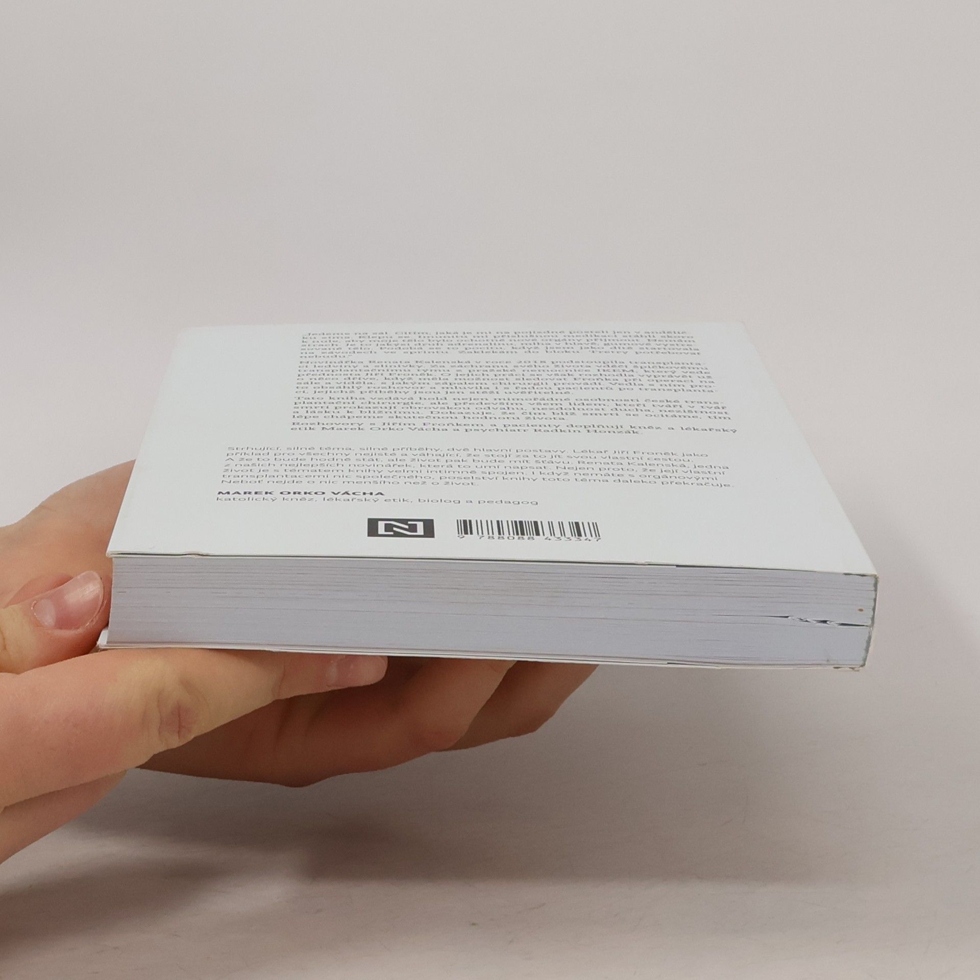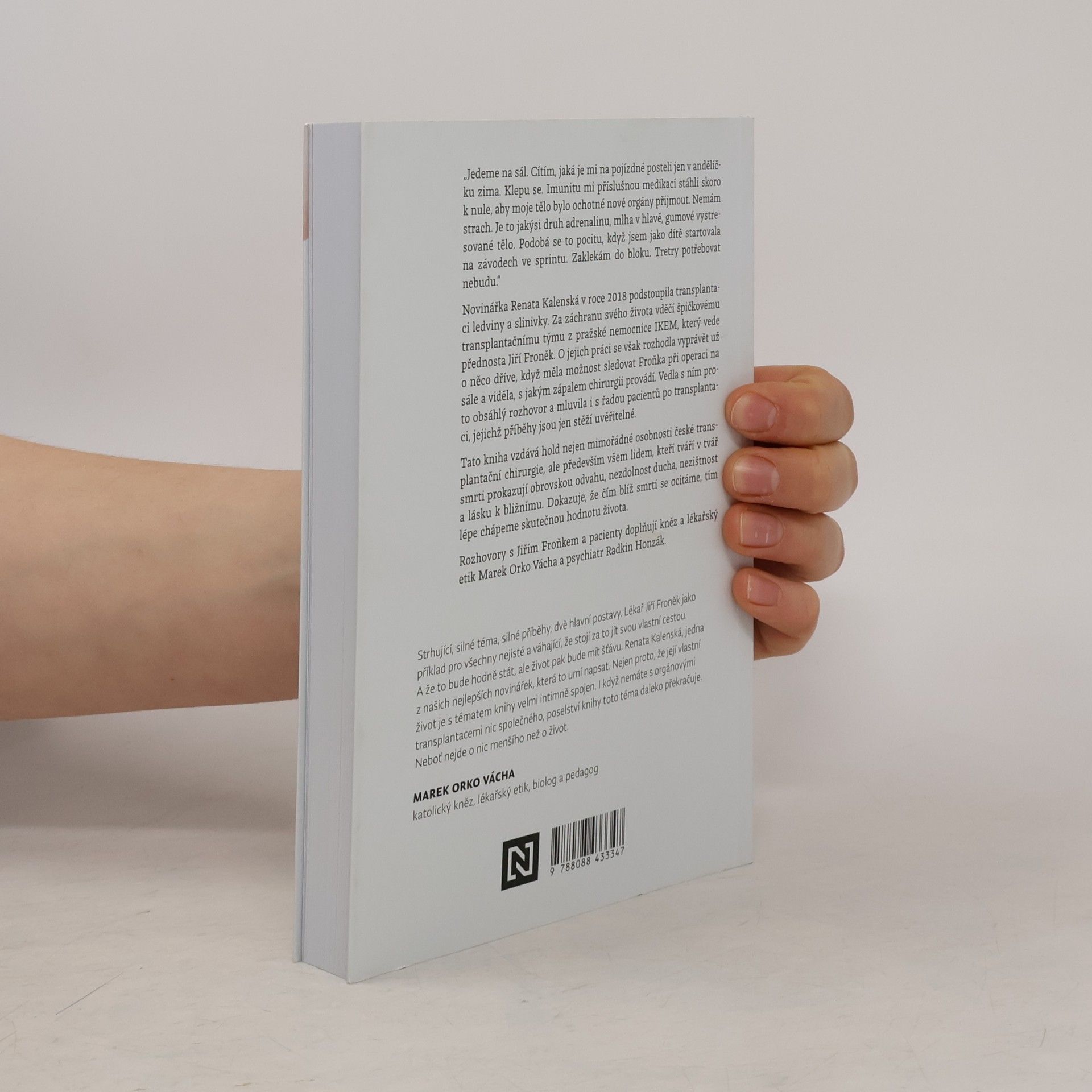 Příběhy české transplantační chirurgie. „Jedeme na sál. Cítím, jaká je mi na pojízdné posteli jen v andělíčku zima. Klepu se. Imunitu mi příslušnou medikací stáhli skoro k nule, aby moje tělo bylo ochotné nové orgány přijmout. Nemám strach. Je to jakýsi druh adrenalinu, mlha v hlavě, gumové vystresované tělo. Podobá se to pocitu, když jsem jako dítě startovala na závodech ve sprintu. Zaklekám do bloku. Tretry potřebovat nebudu.“Novinářka Renata Kalenská v roce 2018 podstoupila transplantaci ledviny a slinivky. Za záchranu svého života vděčí špičkovému transplantačnímu týmu z pražské nemocnice IKEM, který vede přednosta Jiří Froněk. O jejich práci se však rozhodla vyprávět už o něco dříve, když měla možnost sledovat Froňka při operaci na sále a viděla, s jakým zápalem chirurgii provádí. Vedla s ním proto obsáhlý rozhovor a mluvila také s řadou pacientů po transplantaci, jejichž příběhy jsou jen stěží uvěřitelné.Tato kniha vzdává hold nejen mimořádné osobnosti české transplantační chirurgie, ale především všem lidem, kteří tváří v tvář smrti prokazují obrovskou odvahu, nezdolnost ducha, nezištnost a lásku k bližnímu. Dokazuje, že čím blíž smrti se ocitáme, tím lépe chápeme skutečnou hodnotu života.Rozhovory s Jiřím Froňkem a pacienty doplňují kněz a lékařský etik Marek Orko Vácha a psychiatr Radkin Honzák.