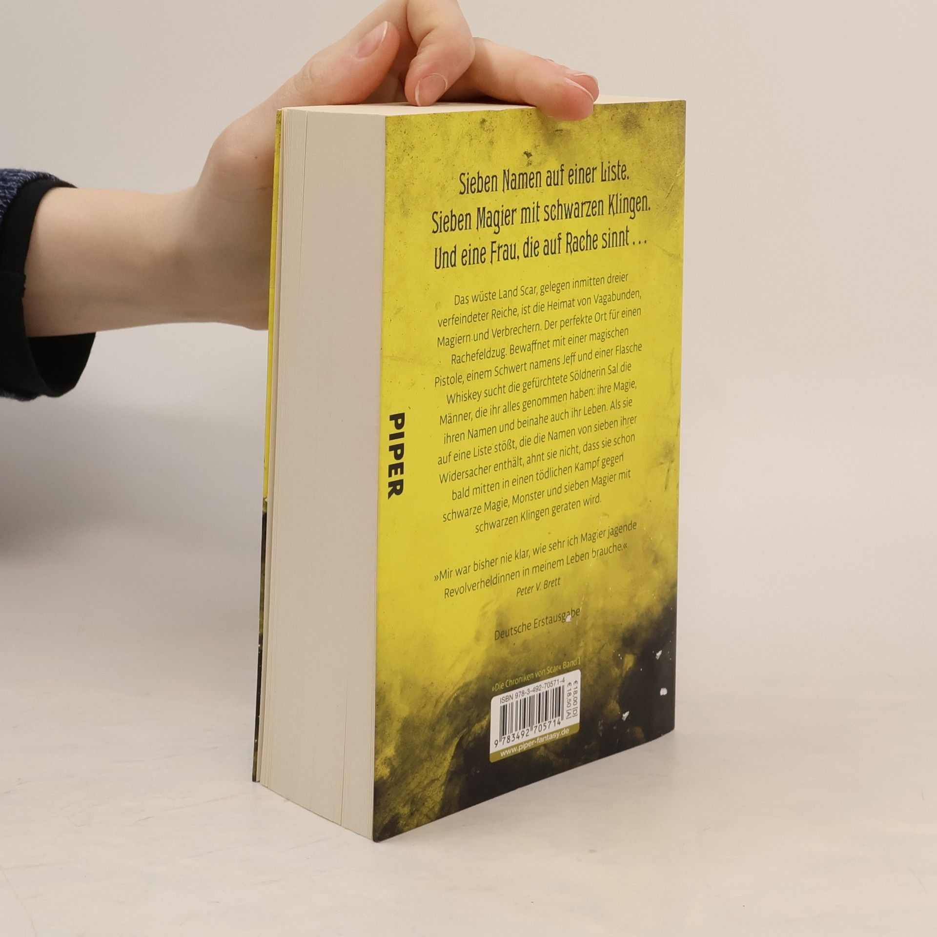 Sieben Namen auf einer Liste.Sieben Magier mit schwarzen Klingen.Und eine Frau, die auf Rache sinnt … Das wüste Land Scar, gelegen inmitten dreier verfeindeter Reiche, ist die Heimat von Vagabunden, Magiern und Verbrechern. Der perfekte Ort für einen Rachefeldzug. Bewaffnet mit einer magischen Pistole, einem Schwert namens Jeff und einer Flasche Whiskey zieht die gefürchtete Söldnerin Sal durch das Land, auf der Suche nach den Männern, die ihr alles genommen haben: Ihre Magie, ihren Namen und beinahe auch ihr Leben. Als sie auf eine Liste stößt, die die Namen von sieben ihrer Widersacher enthält, ahnt sie nicht, dass sie schon bald mitten in einen tödlichen Kampf gegen schwarze Magie, Monster und sieben Magier mit schwarzen Klingen geraten wird. »Mir war bisher nie klar, wie sehr ich Magier jagende Revolverheldinnen in meinem Leben brauche.« Peter V. Brett