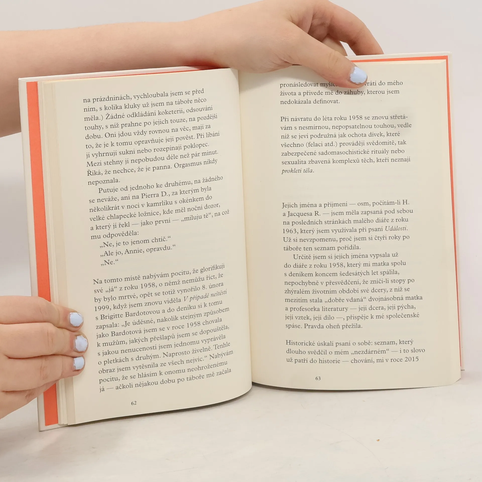 Vzpamatujeme se někdy z ponížení? V létě roku 1958 přijde osmnáctiletá Annie Ernauxová na letním táboře v Normandii o panenství. Teprve ve chvíli, kdy ji dvaadvacetiletý instruktor, se kterým stráví noc, opustí, si Ernauxová uvědomí, že se podřídila jeho vůli a že ve svém smutku zůstává „otrokyní bez pána“. O padesát let později jí dochází, že může uplynulé roky smazat a vrátit se k úvahám o mladé ženě, na kterou chtěla zcela zapomenout. A zjistit, že právě u ní, zrazené dívky plné studu a ponížení, ale také dívky, která poznává sebe samu a postupně získává sebedůvěru, se skrývá počátek jejího spisovatelského života. Pomocí nesmazatelných obrazů ze své paměti, fotografií a dopisů psaných v té době přátelům autorka hledá dívku, kterou kdysi byla, v neúprosných návratech mezi včerejškem a dneškem.
