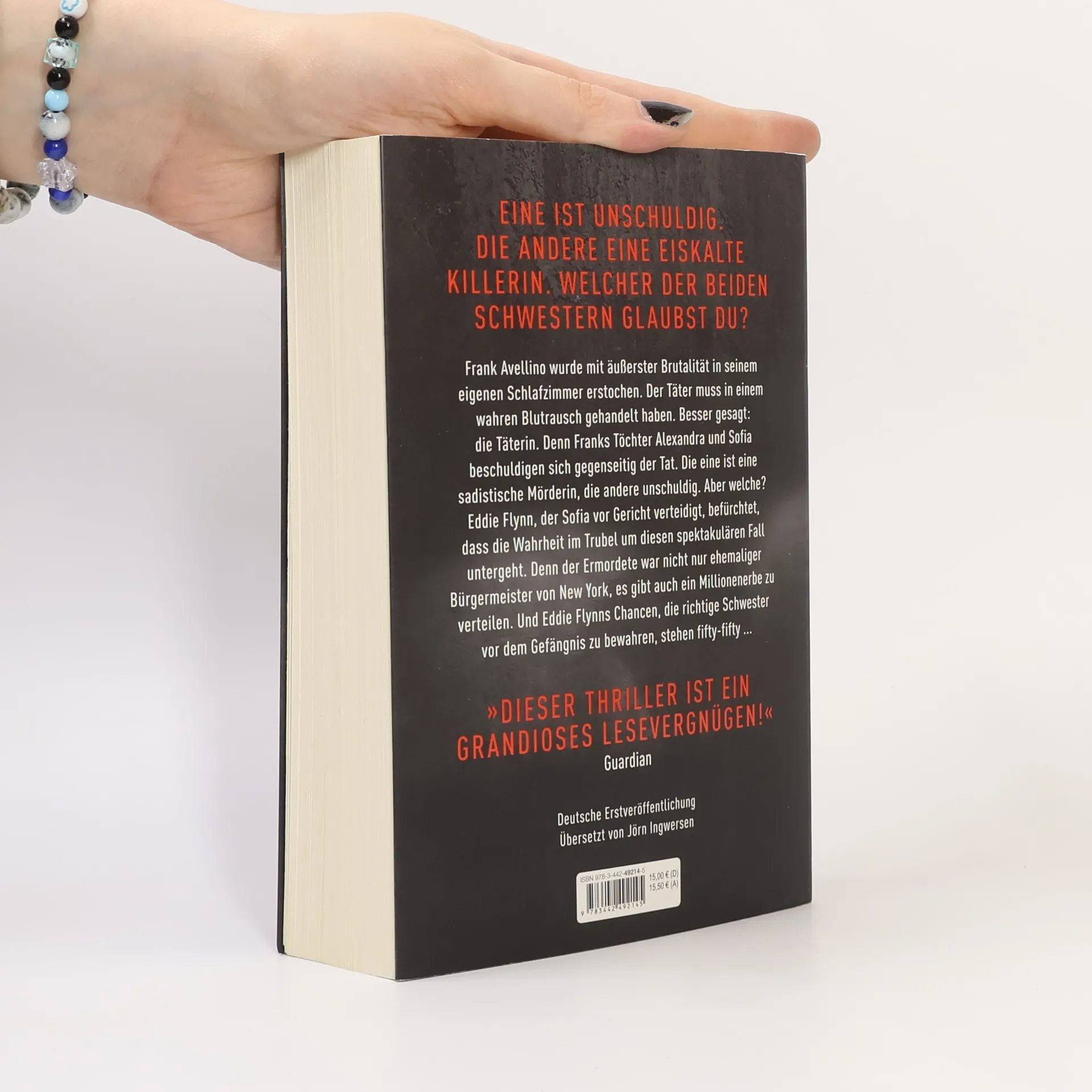 Eine ist unschuldig. Die andere eine eiskalte Killerin. Welcher der beiden Schwestern glaubst du? Frank Avellino wurde mit äußerster Brutalität in seinem eigenen Schlafzimmer erstochen, der Täter muss in einem wahren Blutrausch gehandelt haben. Besser gesagt: die Täterin. Denn Franks Töchter Alexandra und Sofia beschuldigen sich gegenseitig der Tat. Die eine ist eine sadistische Mörderin, die andere unschuldig. Aber welche? Sowohl Eddie Flynn, der Sofia vor Gericht verteidigt, als auch Alexandras junge Anwältin Kate Brooks befürchten, dass die Wahrheit im Trubel um diesen spektakulären Fall untergeht. Denn der Ermordete war nicht nur ehemaliger Bürgermeister von New York, es gibt auch ein Millionenerbe zu verteilen. Und Eddie Flynns Chancen, die richtige Schwester vor dem Gefängnis zu bewahren, stehen fifty-fifty ...