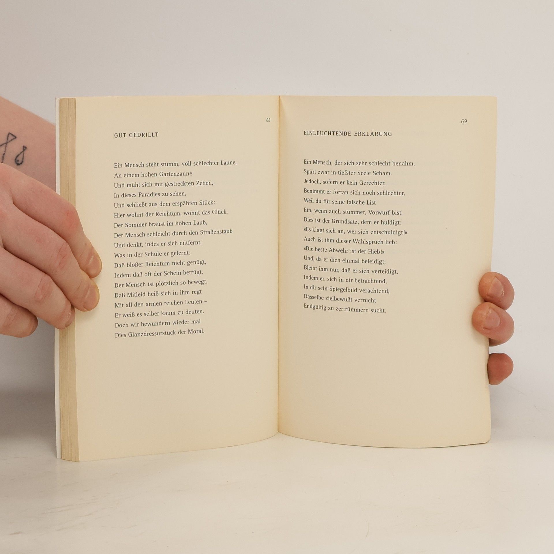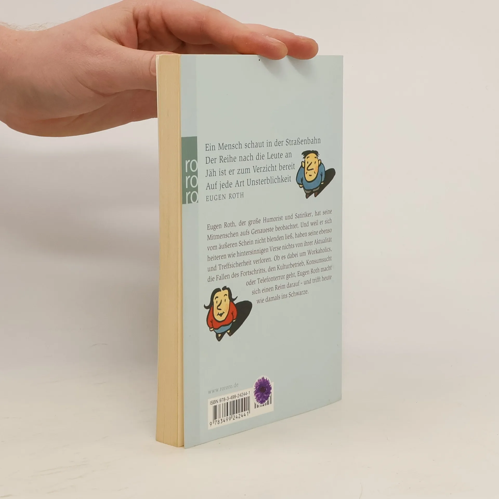 Ein Mensch schaut in der Straßenbahn / Der Reihe nach die Leute an / Jäh ist er zum Verzicht bereit / Auf jede Art Unsterblichkeit (Eugen Roth)Eugen Roth, der große Humorist und Satiriker, hat seine Mitmenschen aufs Genaueste beobachtet. Und weil er sich vom äußeren Schein nicht blenden ließ, haben seine ebenso heiteren wie hintersinnigen Verse nichts von ihrer Aktualität und Treffsicherheit verloren. Ob es dabei um Workaholics, die Fallen des Fortschritts, den Kulturbetrieb, Konsumsucht oder Telefonterror geht, Eugen Roth macht sich einen Reim darauf – und trifft heute wie damals ins Schwarze.