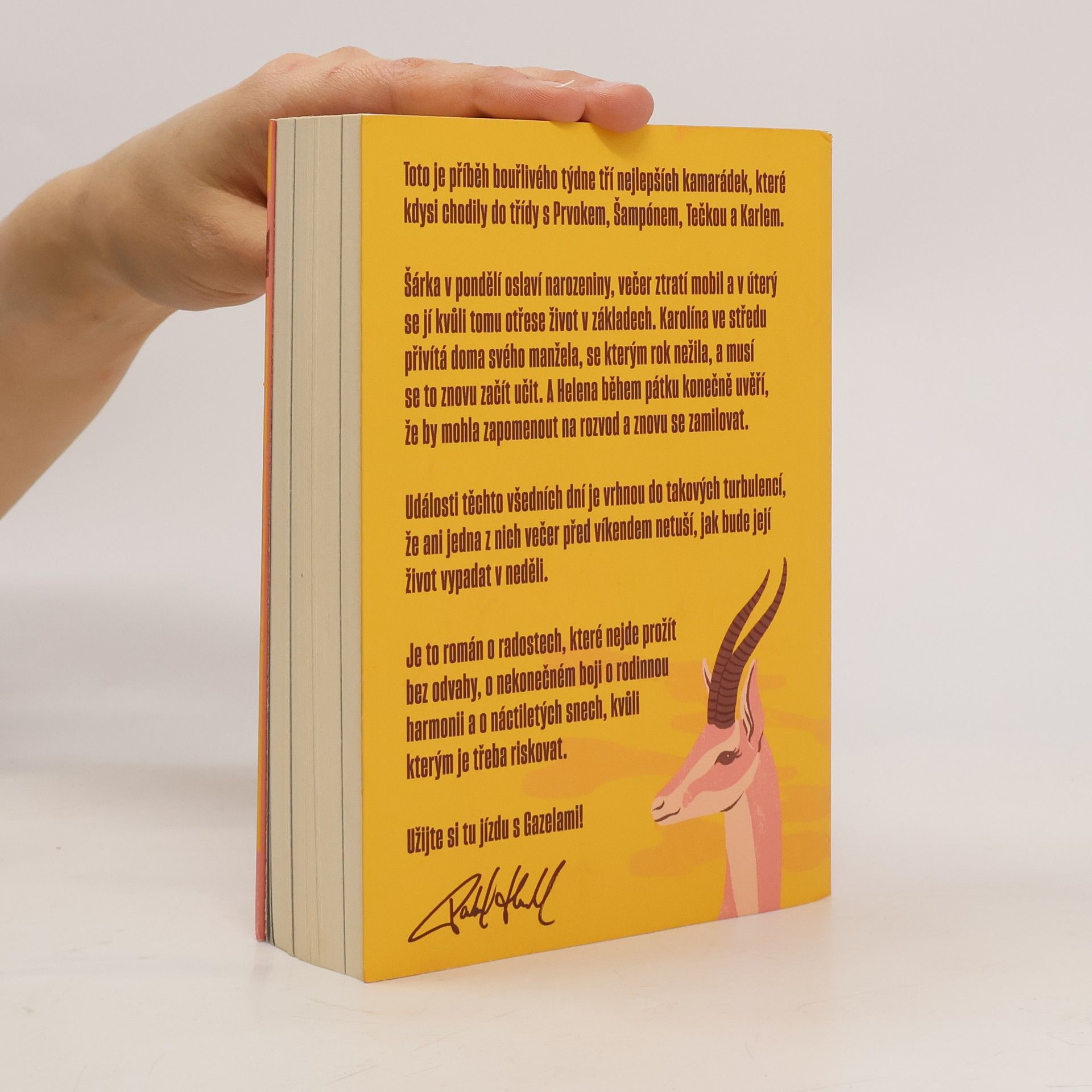 Gazely vypráví příběh jednoho bouřlivého týdne tří blízkých kamarádek, které kdysi chodily do školy s Prvokem, Šampónem, Tečkou a Karlem. Šárka začíná týden narozeninovou oslavou, ale ztráta mobilu jí už v úterý převrátí život naruby. Karolína se ve středu setkává se svým manželem, se kterým po roce odloučení zkouší obnovit vztah. Helena v pátek zjišťuje, že by mohla nechat rozvod za sebou a znovu najít lásku. Během těchto několika dní se jejich životy ocitnou ve víru změn, takže ani jedna z nich nemá tušení, jaké překvapení je čeká do neděle. Tento román je o radosti, která vyžaduje odvahu, o neustálém úsilí najít rovnováhu v rodině a o snech z mládí, kvůli kterým stojí za to riskovat.