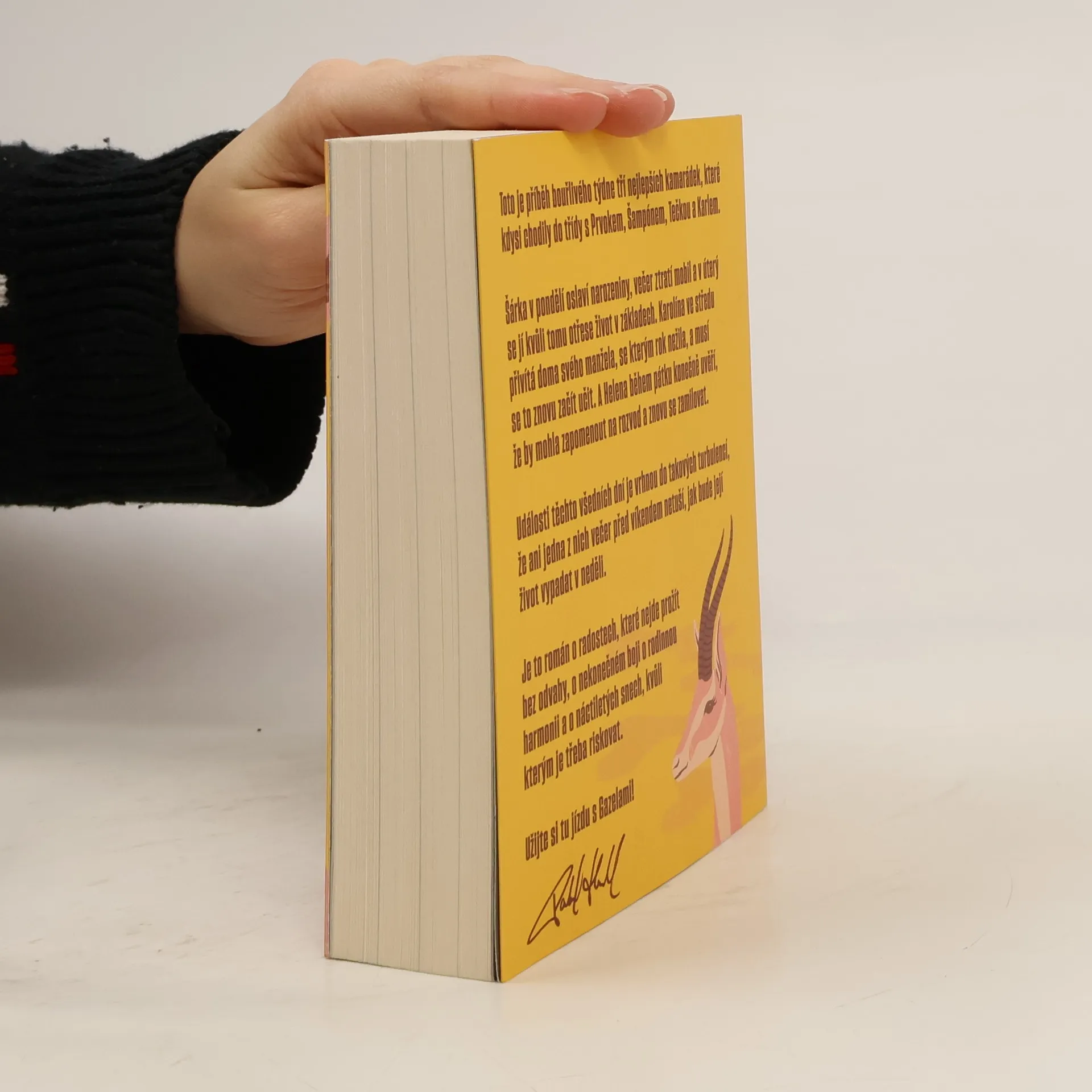 Gazely vypráví příběh jednoho bouřlivého týdne tří blízkých kamarádek, které kdysi chodily do školy s Prvokem, Šampónem, Tečkou a Karlem. Šárka začíná týden narozeninovou oslavou, ale ztráta mobilu jí už v úterý převrátí život naruby. Karolína se ve středu setkává se svým manželem, se kterým po roce odloučení zkouší obnovit vztah. Helena v pátek zjišťuje, že by mohla nechat rozvod za sebou a znovu najít lásku. Během těchto několika dní se jejich životy ocitnou ve víru změn, takže ani jedna z nich nemá tušení, jaké překvapení je čeká do neděle. Tento román je o radosti, která vyžaduje odvahu, o neustálém úsilí najít rovnováhu v rodině a o snech z mládí, kvůli kterým stojí za to riskovat.