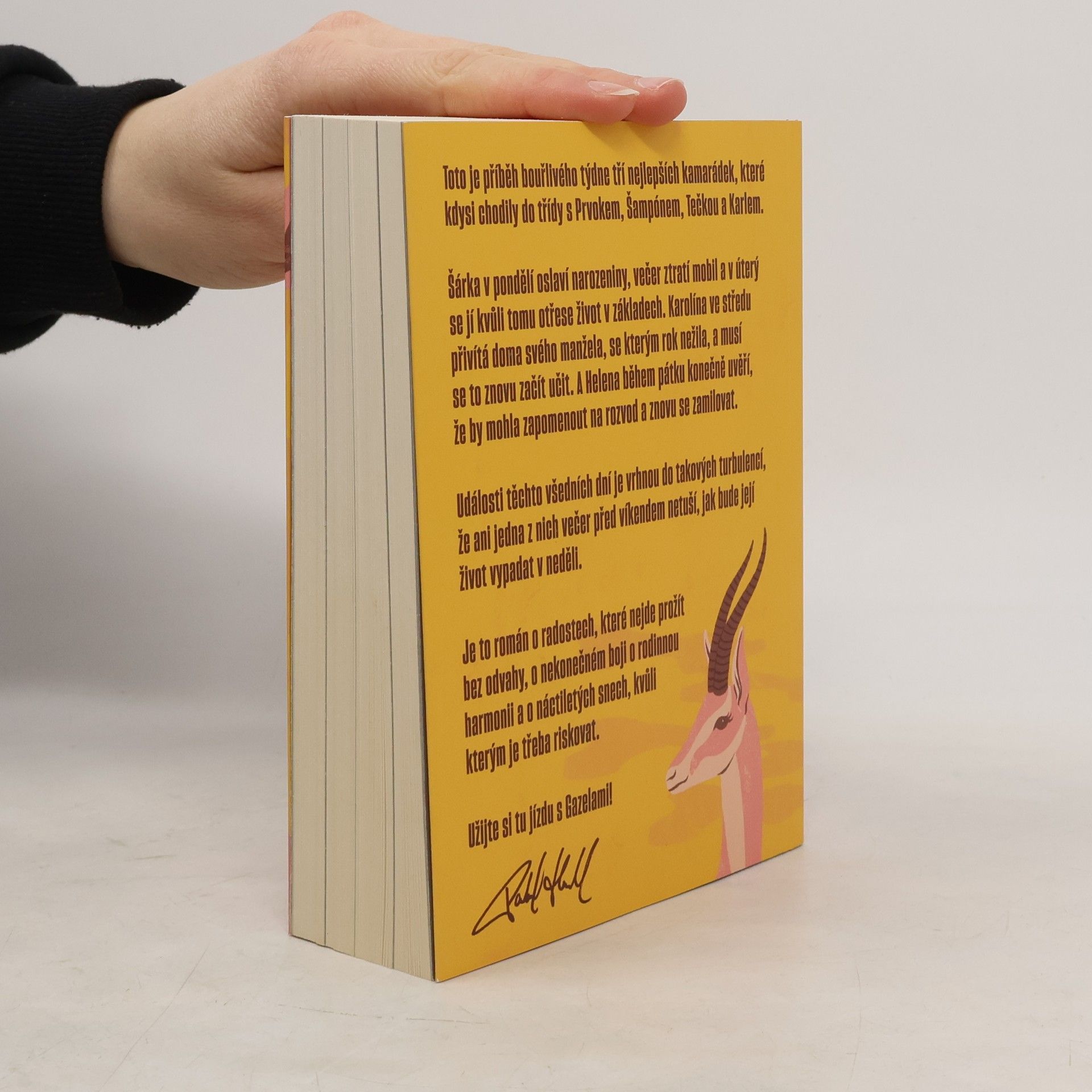 Gazely vypráví příběh jednoho bouřlivého týdne tří blízkých kamarádek, které kdysi chodily do školy s Prvokem, Šampónem, Tečkou a Karlem. Šárka začíná týden narozeninovou oslavou, ale ztráta mobilu jí už v úterý převrátí život naruby. Karolína se ve středu setkává se svým manželem, se kterým po roce odloučení zkouší obnovit vztah. Helena v pátek zjišťuje, že by mohla nechat rozvod za sebou a znovu najít lásku. Během těchto několika dní se jejich životy ocitnou ve víru změn, takže ani jedna z nich nemá tušení, jaké překvapení je čeká do neděle. Tento román je o radosti, která vyžaduje odvahu, o neustálém úsilí najít rovnováhu v rodině a o snech z mládí, kvůli kterým stojí za to riskovat.