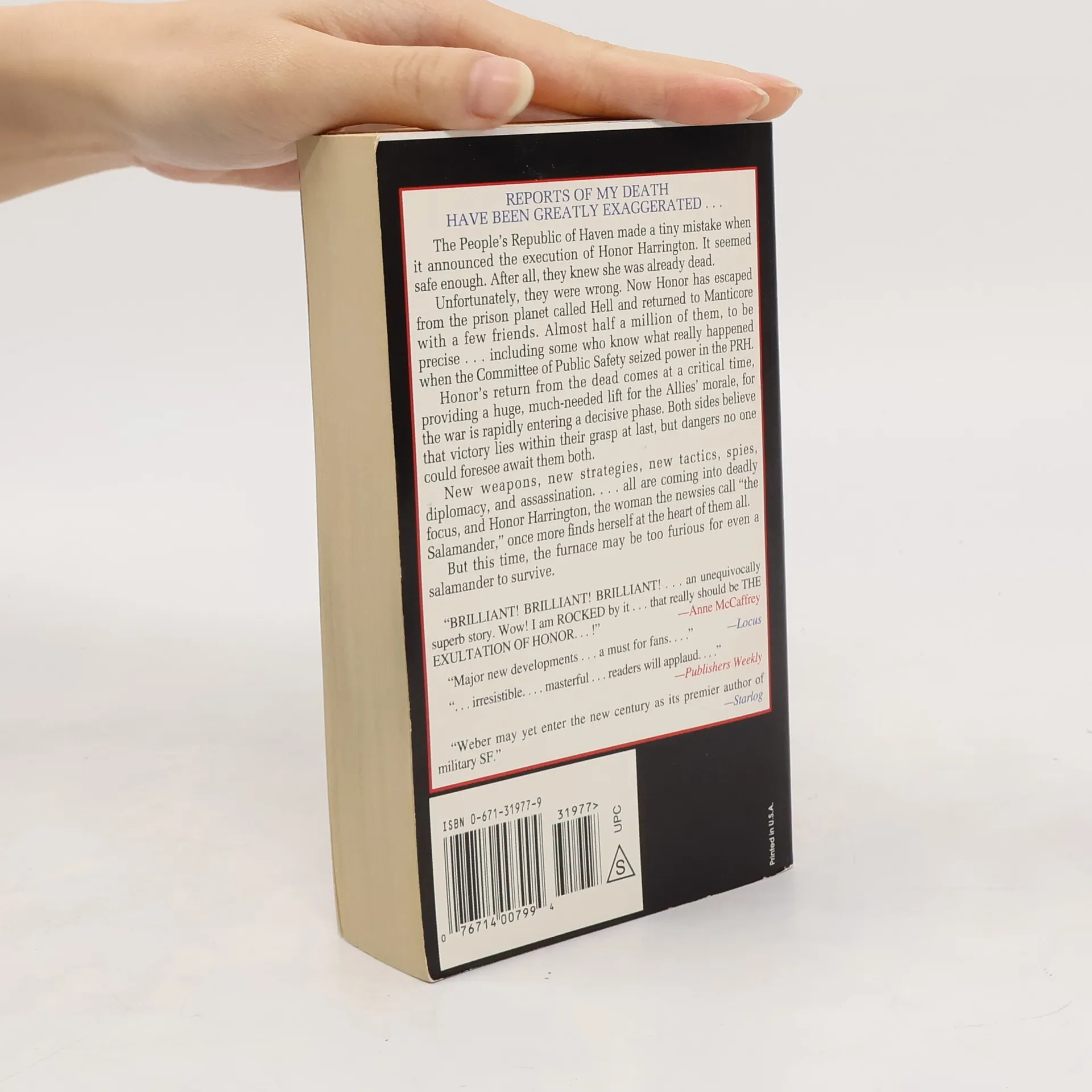 The People's Republic of Haven made a tiny mistake when it announced the execution of Honor Harrington. It seemed safe enough. After all, she was already dead. Unfortunately, they were wrong. Now Honor has escaped from the prison planet called Hell and returned to the Manticoran Alliance with a few friends. Almost half a million of them, to be precise including some who know what really happened when the Committee of Public Safety seized power in the PRH. Honor's return from the dead comes at a critical time, providing a huge, much-needed lift for the Allies' morale, for the war is rapidly entering a decisive phase. Both sides believe that victory lies within their grasp at last, but dangers no one could foresee await them both. New weapons, new strategies, new tactics, spies, diplomacy, and assassination all are coming into deadly focus, and Honor Harrington, the woman the newsies call "the Salamander," once more finds herself at the heart of them all. But this time, the furnace may be too furious for even a salamander to survive.
