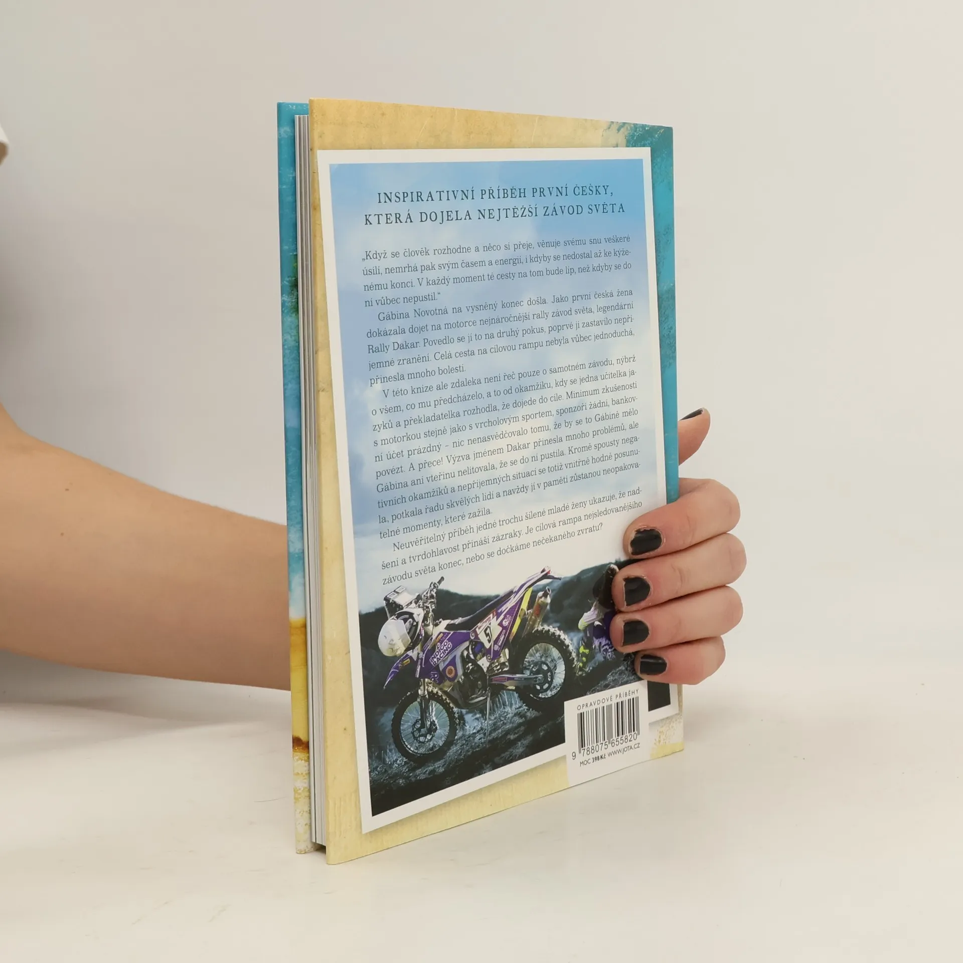 Inspirativní příběh první Češky, která dojela nejtěžší závod světa. „Když se člověk rozhodne a něco si přeje, věnuje svému snu veškeré úsilí, nemrhá pak svým časem a energií, i kdyby se nedostal až ke kýženému konci. V každý moment té cesty na tom bude líp, než kdyby se do ní vůbec nepustil.“ Gábina Novotná na vysněný konec došla. Jako první česká žena dokázala dojet na motorce nejnáročnější rally závod světa, legendární Rally Dakar. Povedlo se jí to na druhý pokus, poprvé ji zastavilo nepříjemné zranění. Celá cesta na cílovou rampu nebyla vůbec jednoduchá, přinesla mnoho bolesti. V této knize ale zdaleka není řeč pouze o samotném závodu, nýbrž o všem, co mu předcházelo, a to od okamžiku, kdy se jedna učitelka jazyků a překladatelka rozhodla, že dojede do cíle. Minimum zkušeností s motorkou stejně jako s vrcholovým sportem, sponzoři žádní, bankovní účet prázdný – nic nenasvědčovalo tomu, že by se to Gabče mělo povézt. A přece! Výzva jménem Dakar přinesla mnoho problémů, ale Gabča ani vteřinu nelitovala, že se do ní pustila. Kromě spousty negativních okamžiků a nepříjemných situací se totiž vnitřně hodně posunula, potkala řadu skvělých lidí a navždy jí v paměti zůstanou neopakovatelné momenty, které zažila. Neuvěřitelný příběh jedné trochu šílené mladé ženy ukazuje, že nadšení a tvrdohlavost přináší zázraky. Je cílová rampa nejsledovanějšího závodu světa konec, nebo se dočkáme nečekaného zvratu?