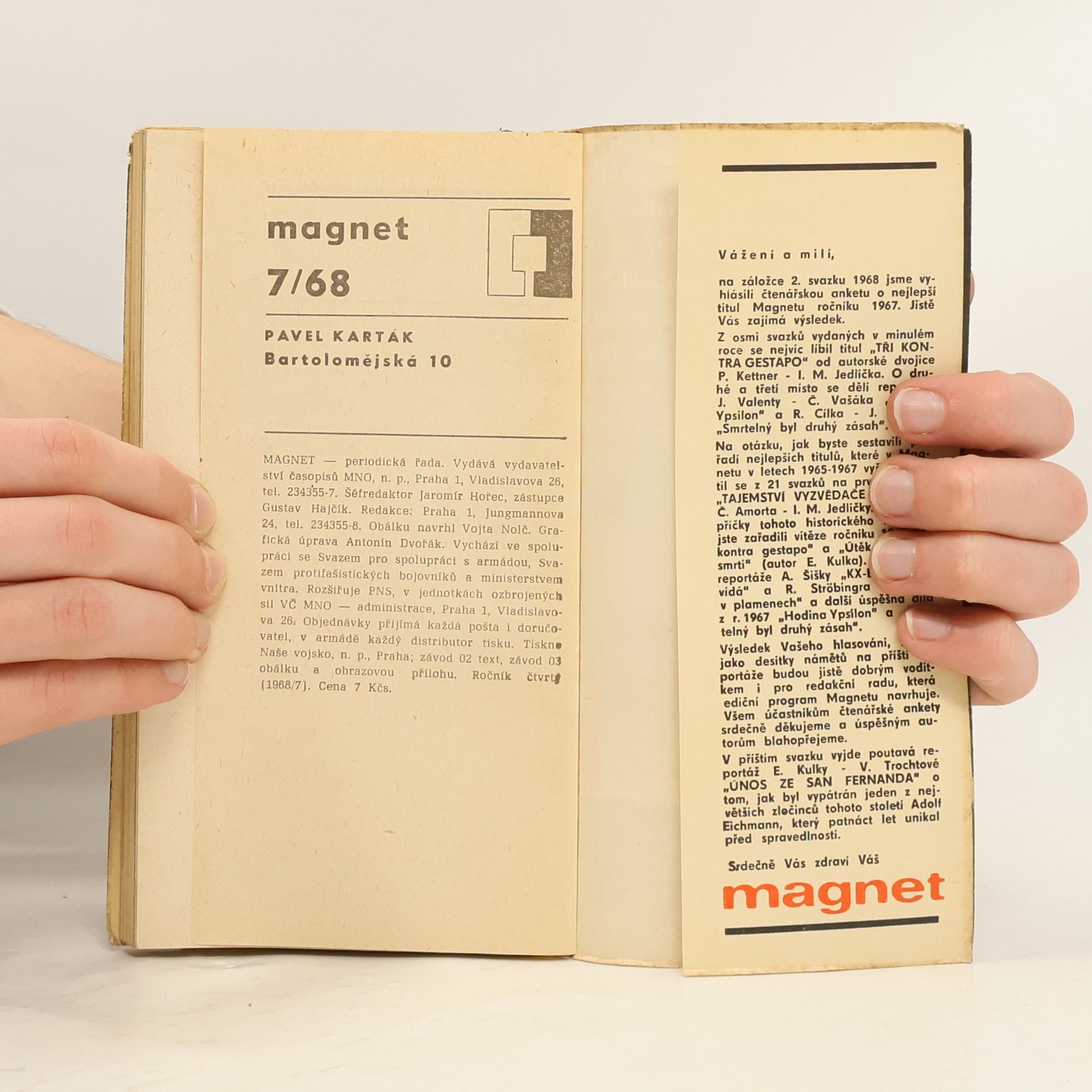 Knihu psal pod jménem Pavel Karták. Soubor kriminálních reportáží (Výstřel ze slepé uličky, Vražda ve středu kružnice, Most přes řeku Svratku, Věci doličné, Podnájem pro mrtvého muže, Hra na slepou bábu), napsaných podle skutečných příběhů a pojmenovanýchpodle pražské ulice, v níž je ústřední sídlo našich kriminalistů a zejména pak kartotéky obsahující všechny trestné činy v tomto státě. Příběhy, v nichž autor nechává při změnách jmen mluvit protokoly, svědecké výpovědi adokumentární fotografie, zachycují otřesné případy mnohonásobných loupeží a loupežných vražd.