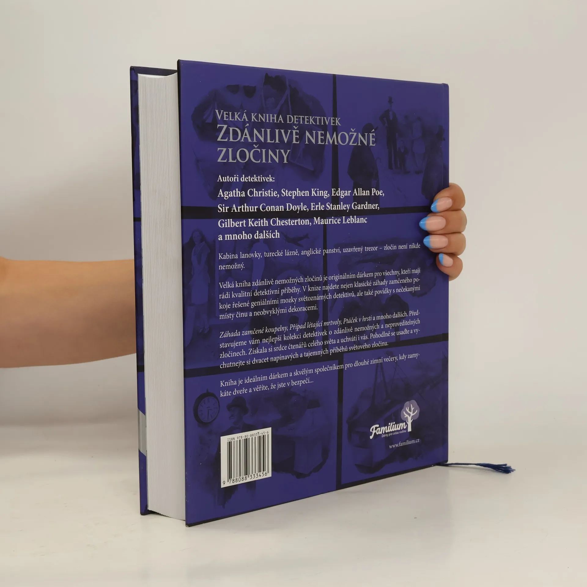 Záhady zamčeného pokoje a další nevysvětlitelné příběhy. Agatha Christie, Stephen King, Edgar Allan Poe, Erle Stanley Gardner, Sir Arthur Conan Doyle a mnoho dalších. Ať už jde o kabinu lanovky, turecké lázně, anglické panství nebo uzavřené trezory - zločin není nikde nemožný.Velká kniha zdánlivě nemožných zločinů představuje originální dárek pro všechny, kteří si oblíbili prvotřídní detektivní příběhy. V této knize nenajdete pouze tradiční záhady zamčeného pokoje, které vyřeší jen brilantní důvtip světově proslulých detektivů, ale také povídky s nečekanými místy činu a netradičním prostředím.