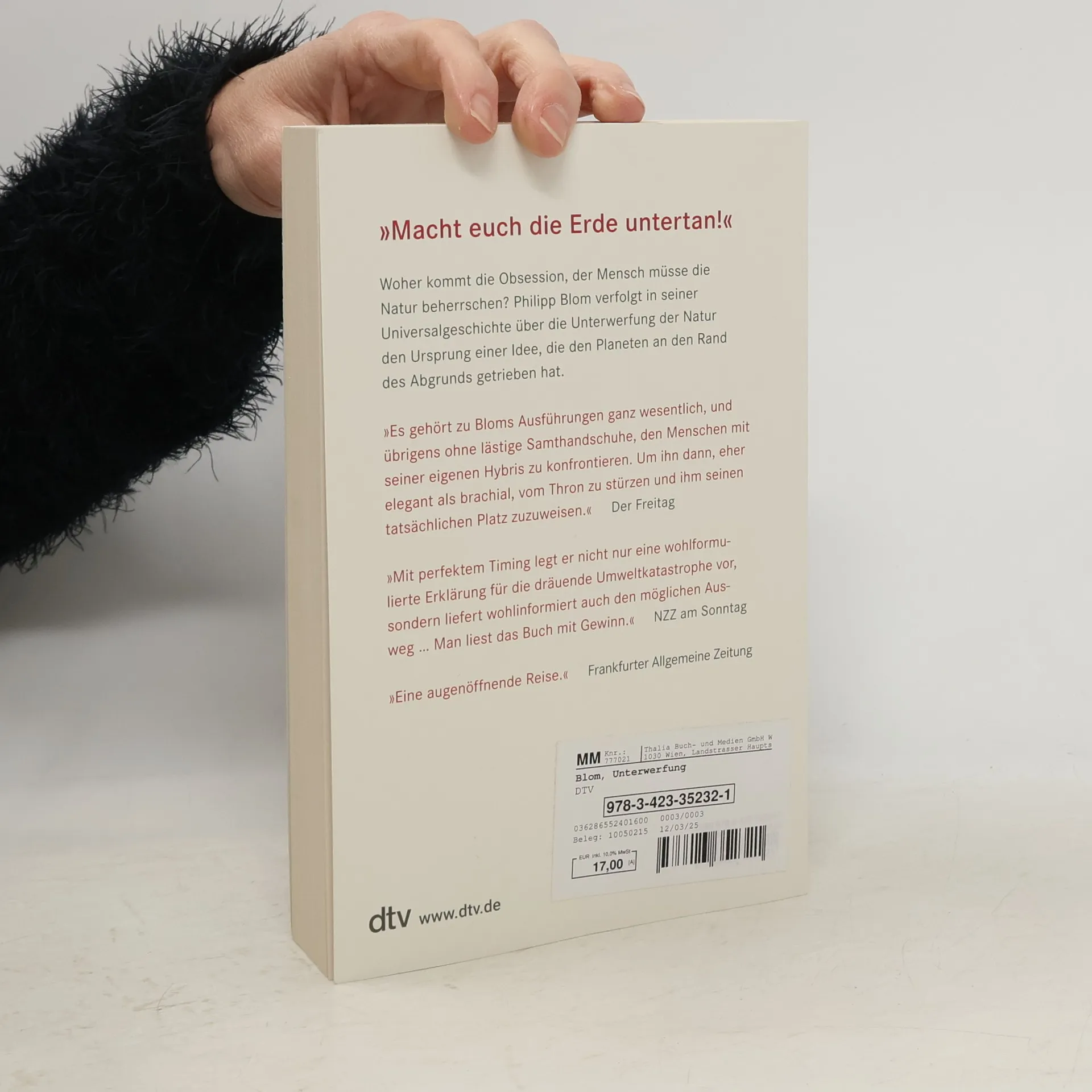 »Macht euch die Erde untertan« Vor rund 3000 Jahren legte der Autor der Genesis seinem Schöpfer diesen Satz in den Mund. Damit war die Idee geboren, dass der Mensch eine Sonderstellung auf der Erde einnimmt und deren Ressourcen rücksichtslos ausbeuten darf. Sie war so stark, dass sie sich über den ganzen Planeten verbreitete. Wer sich ihr widersetzte, bekam es mit Kolonisatoren und Geschäftemachern zu tun, die sich auf angeblich höhere Werte beriefen. In seiner Universalgeschichte der Umwelt erzählt Philipp Blom die Geschichte der Unterwerfung der Natur, deren Konsequenzen die Menschheit heute an den Rand des Abgrunds führt. Nur wenn sie sich von dem Wahn befreit, über der Natur zu stehen, bleibt ihr die Chance, zu überleben.