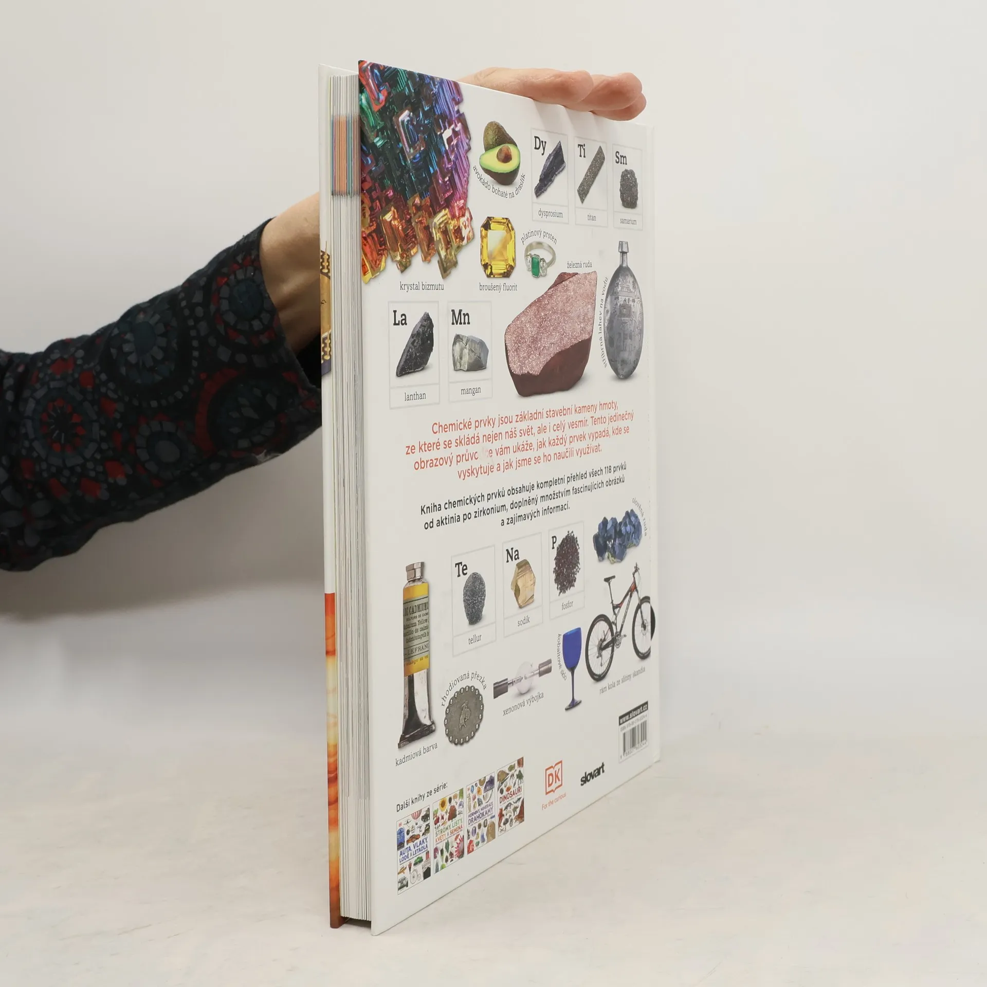Objevuj prvky - základní stavební kameny hmoty, ze kterých se skládá nejen náš svět, ale celý vesmír. Jde třeba o zlato, kyslík, fosfor či helium. Prvků dnes známe celkem 118. Řada z nich má jedinečné, někdy překvapivé chemické a fyzikální vlastnosti. Například gallium je kov, přesto se ti teplem rozteče v dlani, fluor je plyn, který může vypálit díru do betonu! Prvky se většinou nenacházejí v čisté formě. Najdeme je sloučené s jinými prvky ve sloučeninách. Třeba vodík a kyslík se nacházejí ve vodě, sodík a chlor utvářejí kuchyňskou sůl a uhlík je součástí milionů sloučenin, z nichž mnohé tvoří naše těla. V knize podrobně prozkoumáme periodickou tabulku prvků, od aktinia po zirkon. Prvky jsou v ní uspořádané podle příbuzných vlastností. Vědci z této neocenitelné pomůcky získali spoustu cenných informací a ty si přečteš příběh každého prvku doplněný fascinujícími fotografiemi - o tom, jak byl objeven, jaké má vlastnosti a jak jej můžeme využít.
