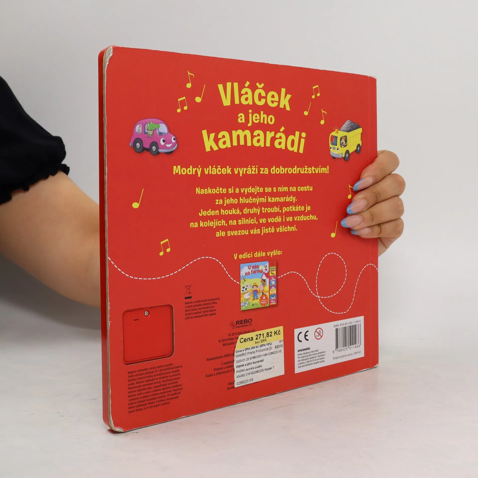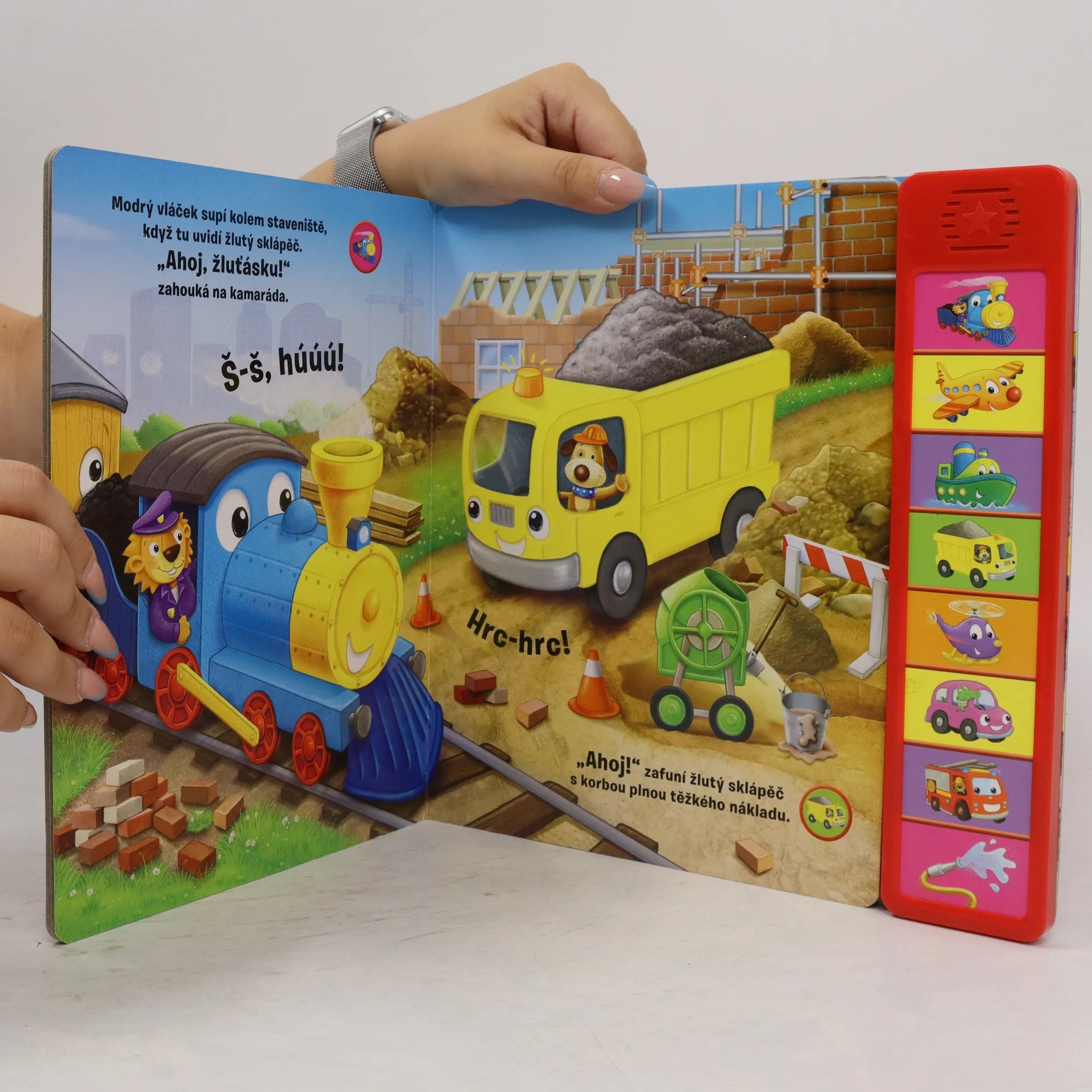 Jaké zvuky vydává vlak, auto, helikoptéra, letadlo, hasičský vůz nebo třeba parník? Modrý vláček se vydává za dobrodružstvím a na svých cestách potká na silnici, ve vzduchu i na vodě spoustu hlučných kamarádů. A pochopitelně se s každým hezky nahlas pozdraví. Knížka Vláček a jehokamarádi s jednoduchým příběhem je opatřena osmi tlačítky, po jejichž stisknutí se ozvou jednotlivé dopravní prostředky.