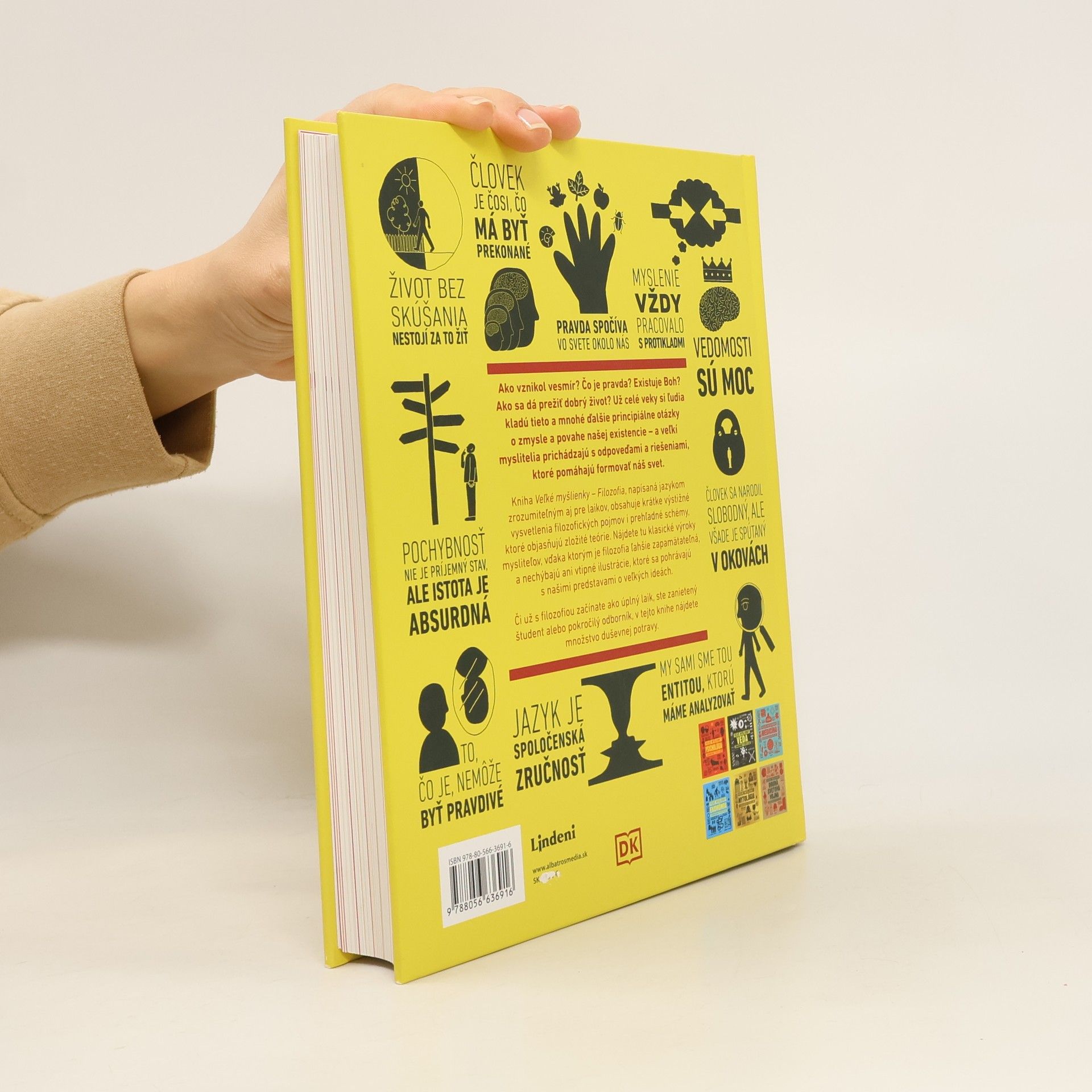 Veľké myšlienky zrozumiteľne podané - pre odborníkov aj pre úplných začiatočníkov. Ako vznikol vesmír? Čo je pravda? Existuje Boh? Ako sa dá prežiť dobrý život? Už celé veky si ľudia kladú tieto a mnohé ďalšie principiálne otázky o zmysle a povahe našej existencie – a veľkí myslitelia prichádzajú s odpoveďami a riešeniami, ktoré pomáhajú formovať náš svet. Kniha obsahuje krátke výstižné vysvetlenia filozofických pojmov i prehľadné schémy, ktoré objasňujú zložité teórie. Nájdete tu klasické výroky mysliteľov, vďaka ktorým je filozofia ľahšie zapamätateľná, a nechýbajú ani vtipné ilustrácie, ktoré sa pohrávajú s našimi predstavami o veľkých ideách. Či už s filozofiou začínate ako úplný laik, ste zanietený študent alebo pokročilý odborník, v tejto knihe nájdete množstvo duševnej potravy.