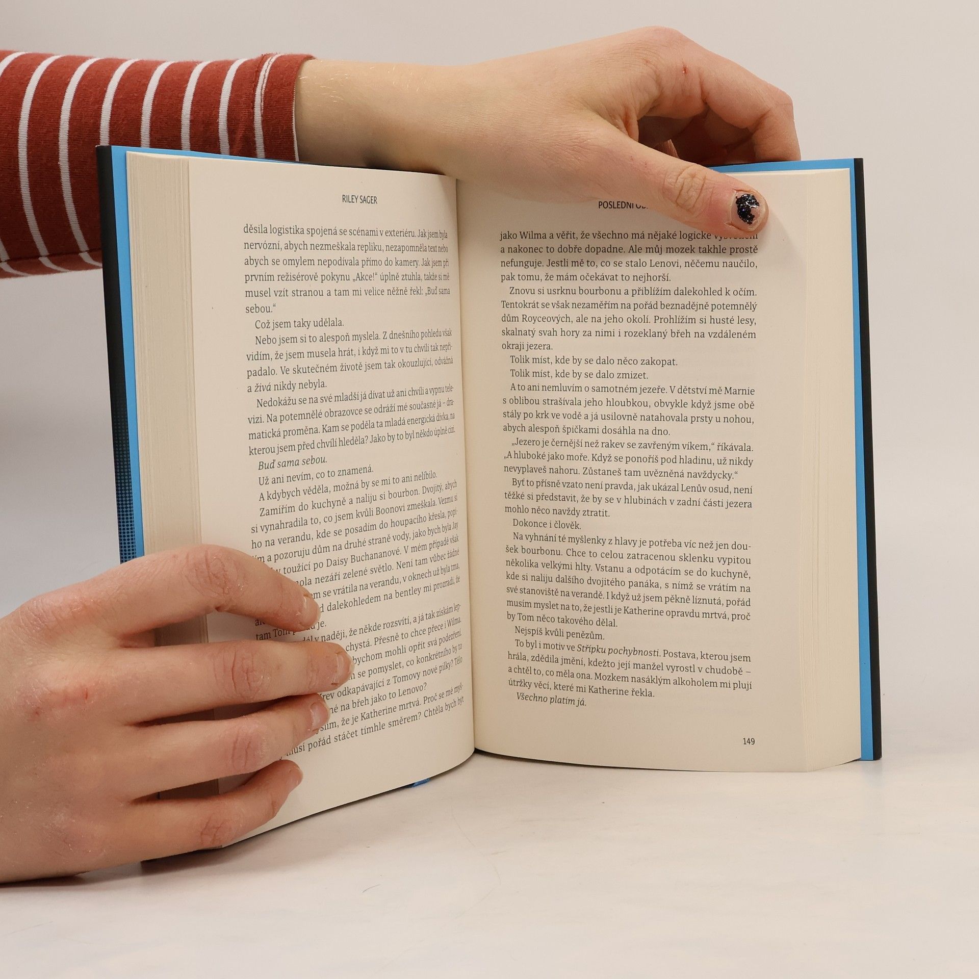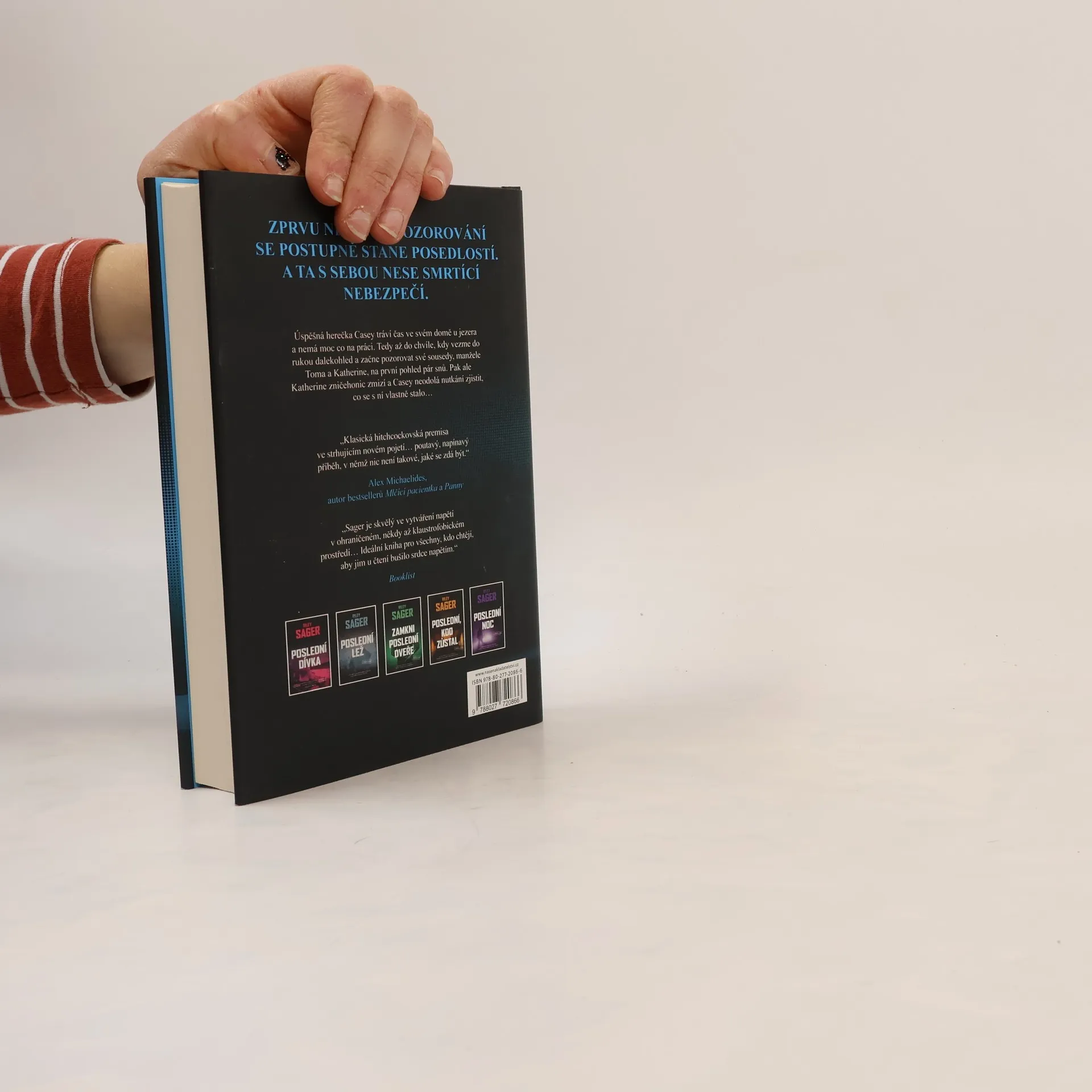 Nedávno ovdovělá herečka Casey Fletcherová se ukryla před bulvárními novináři do letního sídla u klidného jezera ve Vermontu. Vyzbrojena dalekohledem a zásobou lahví svého oblíbeného alkoholu si krátí čas pozorováním Toma a Katherine Royceových, kteří bydlí v domě na protější straně jezera. Je to nádherný pár: Tom je bohatý technologický inovátor, Katherine bývalá modelka. Jednoho dne Casey zachrání Katherine před utonutím v jezeře a vznikne mezi nimi přátelství. Čím více se však poznávají a čím déle Casey sousedy sleduje, tím je jasnější, že manželství Katherine a Toma není zdaleka tak dokonalé a klidné, jak by se mohlo zdát. Když Katherine náhle zmizí, Casey se pokouší zjistit, co se s ní stalo. Odhaluje přitom děsivé a temné pravdy, v jejichž světle se příběh o voyeurismu a podezírání mění v příběh o vině, posedlosti a o tom, jak moc může zdání klamat. Riley Sager ve své nové knize Poslední oběť namíchal typickou směsici výrazných postav, psychologického napětí a překvapivých zvratů, nad nimiž budou čtenáři žasnout až do poslední stránky.
