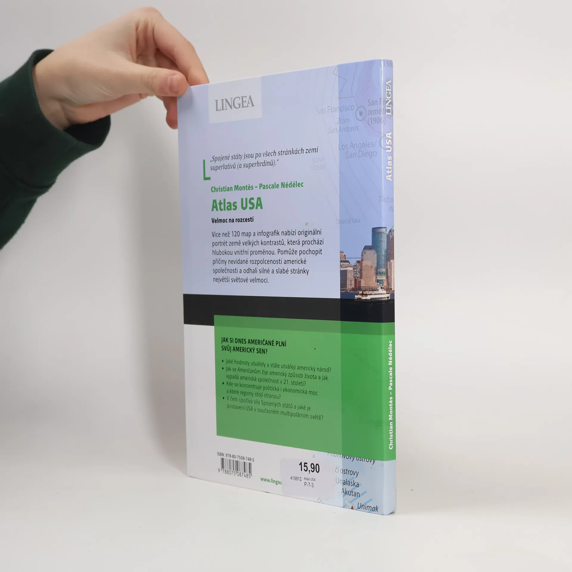 Spojené státy jsou zemí superlativů, ale také čelí vážným problémům. Kniha odhaluje příčiny rozpolcenosti americké společnosti a zkoumá silné a slabé stránky této velmoci. Jak Američané žijí svůj americký sen? Získáte přehled o hodnotách, které utvářejí americký národ, a o životě v USA v 21. století. Zjistíte, kde se koncentruje politická a ekonomická moc a které regiony zůstávají opomíjené. Kniha se zaměřuje na sílu USA a její postavení v multipolárním světě. Atlas je rozdělen do čtyř částí: 1. Zrod a vzestup národa: od předkolumbovské Ameriky po nezávislost, imigraci a metropolizaci. 2. Paradoxy moci: liberalismus, globalizace, řízená imigrace, inovace a energetické zdroje. 3. Americký způsob života a jeho stinné stránky: sen o vlastním domě, automobilový závod, chudoba, nerovnost, segregace a nemocná demokracie. 4. Věří svět stále v americký sen?: kultura, oslabená ekonomika, americká diplomacie a vztahy s Mexikem. Kniha nenabízí jednostranný názor, ale poskytuje fakta pro vlastní úsudek. Moderní geografické přístupy pomáhají vyhnout se zjednodušením a zpochybňují běžná klišé o hospodářských úspěších a boji za svobodu, stejně jako o imperialismu a nerovnosti.