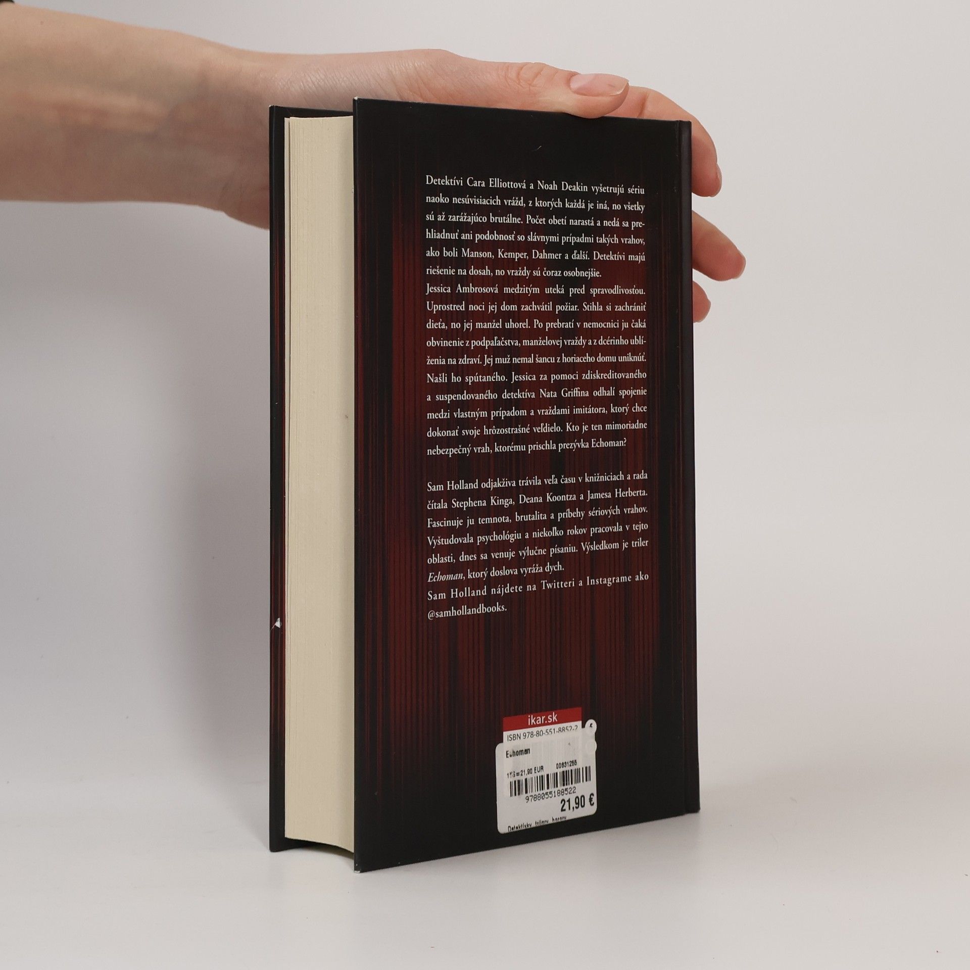 Učil sa od najhorších masových vrahov. Teraz ich chce prekonať. Detektívi Cara Elliottová a Noah Deakin vyšetrujú sériu naoko nesúvisiacich vrážd, z ktorých každá je iná, no všetky sú až zarážajúco brutálne. Počet obetí narastá a nedá sa prehliadnuť ani podobnosť so slávnymi prípadmi takých vrahov, ako boli Manson, Kemper, Dahmer a ďalší. Detektívi majú riešenie na dosah, no vraždy sú čoraz osobnejšie.Jessica Ambrosová medzitým uteká pred spravodlivosťou. Uprostred noci jej dom zachvátil požiar. Stihla si zachrániť dieťa, no jej manžel uhorel. Po prebratí v nemocnici ju čaká obvinie z podpaľačstva, manželovej vraždy a z dcérinho ublíženia na zdraví. Jej muž nemal šancu z horiaceho domu uniknúť. Našli ho spútaného. Jessica za pomoci zdiskreditovaného a suspendovaného detektíva Nata Griffina odhalí zarážajúce spojenie medzi svojím prípadom a vraždami imitátora, ktorý chce dokonať svoje hrôzostrašné veľdielo. Kto je ten mimoriadne nebezpečný vrah, ktorému prischla prezývka Echoman?