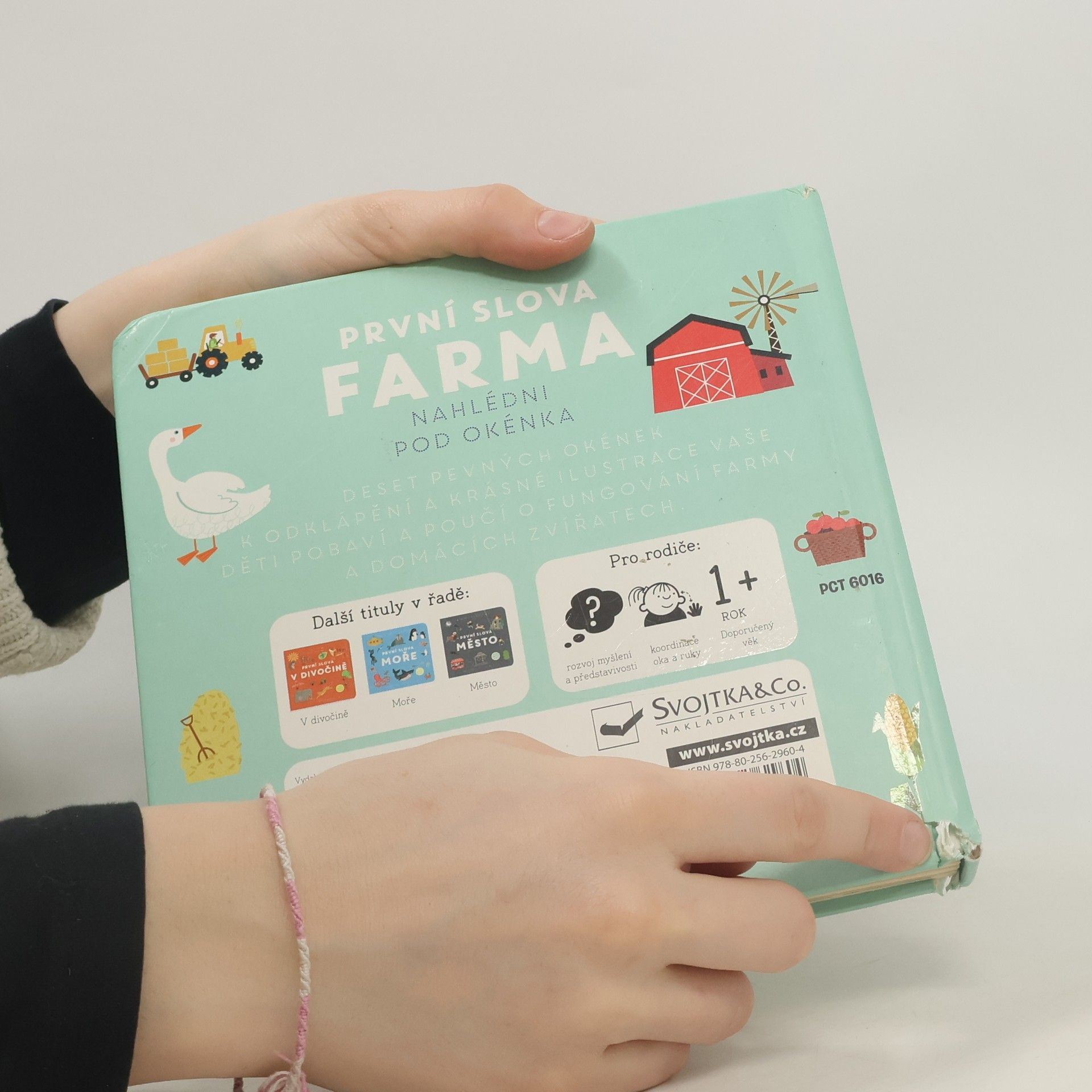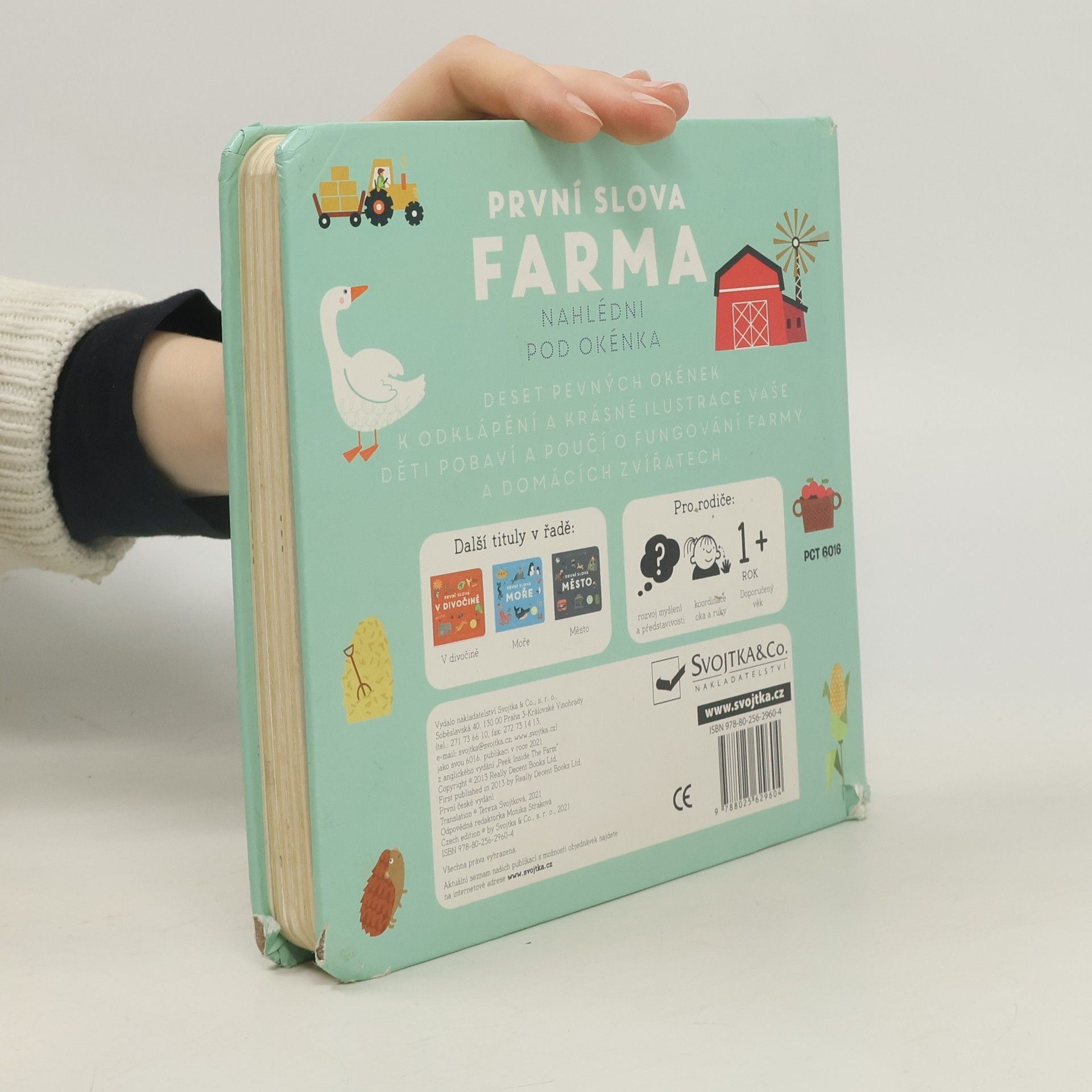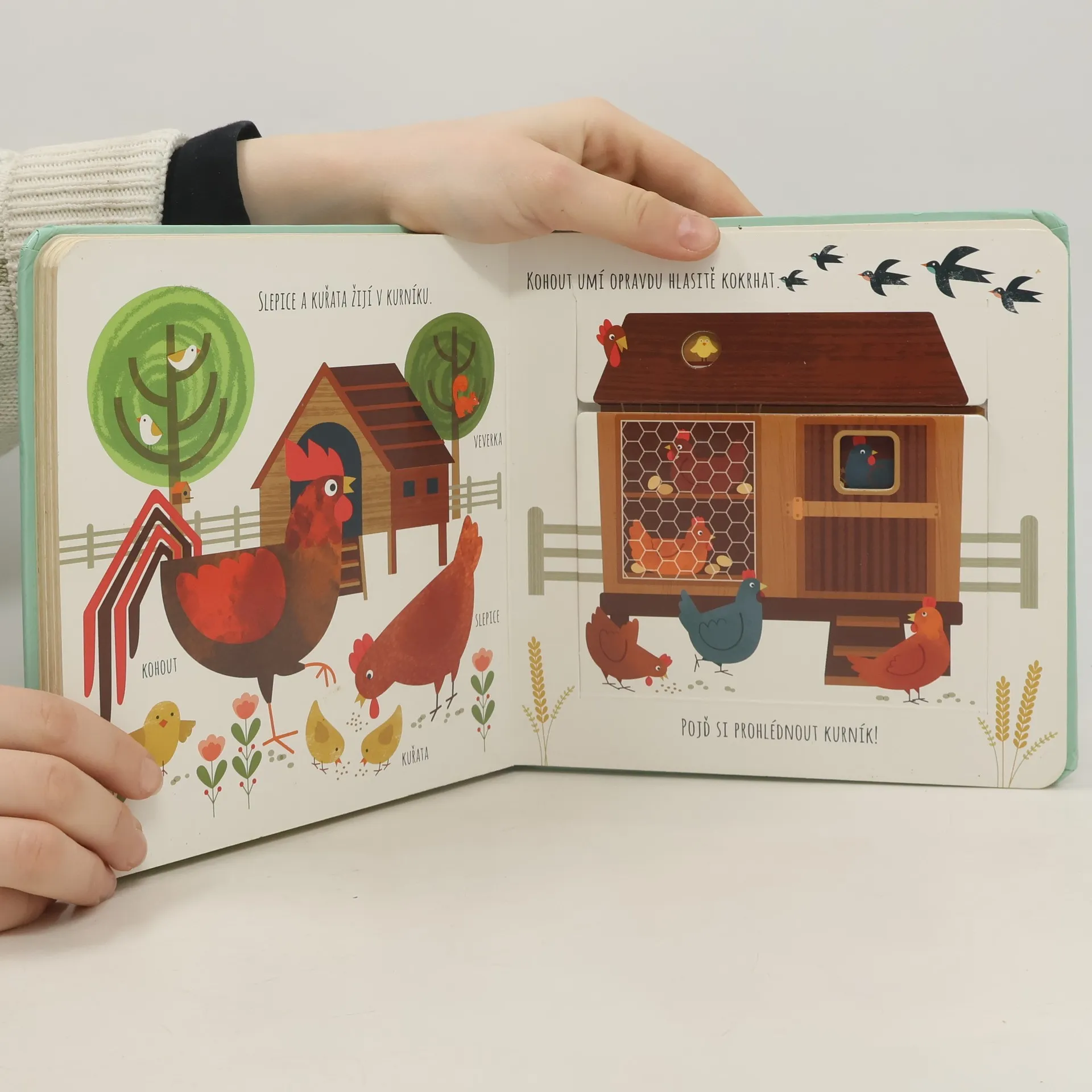 Interaktivní knížka s tuhými listy seznamuje děti s domácí zvířaty a prostředím, ve kterém žijí. Obrázky doplňují krátké popisky.