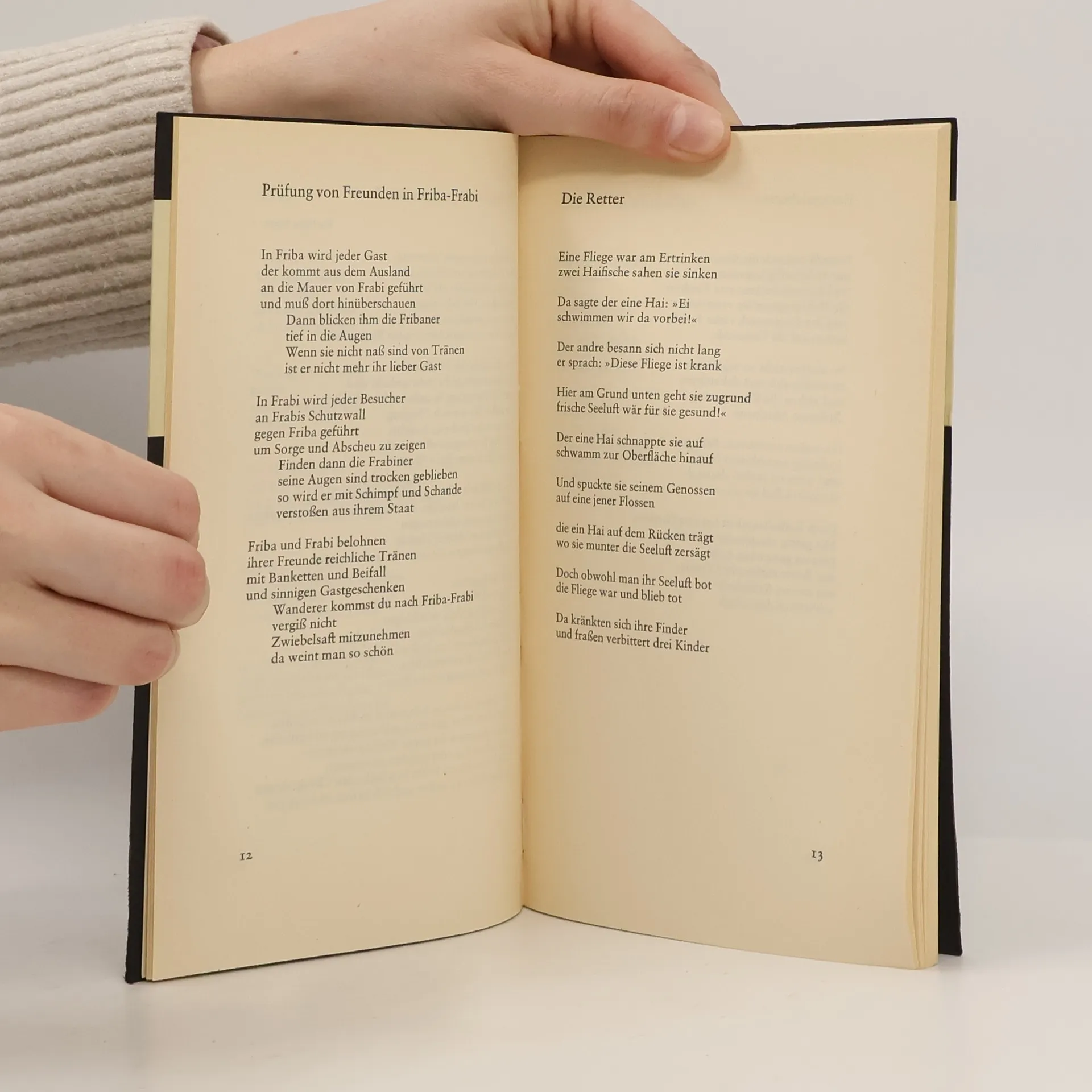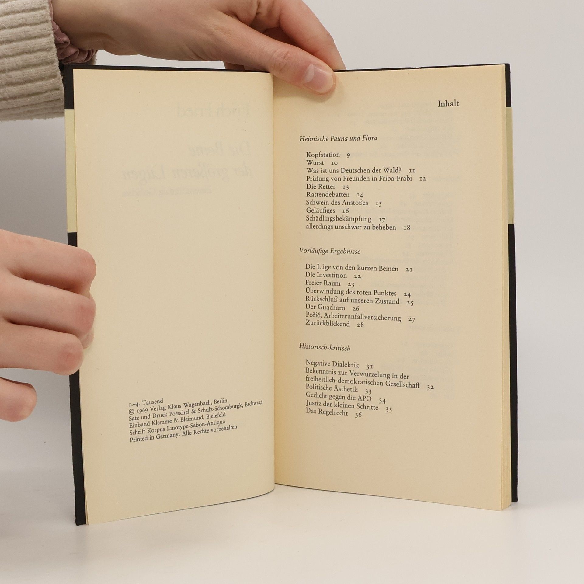 Drei klassische Gedichtsammlungen Erich Frieds in einem Band. Drei Bände, drei Überprüfungen von Redensarten: Die Beine der größeren Lügen – wohin führen die kleinen Lügen bei den großen Reden, wer schützt was vor, um wen zu schützen? Unter Nebenfeinden – über die Kleinigkeiten, die beim Kampf gegen Hauptfeinde leicht vergessen werden. Gegengift – »Bezeichnung solcher Stoffe, die Gift chemisch umsetzen und unwirksam machen« (Meyers Konversationslexikon).