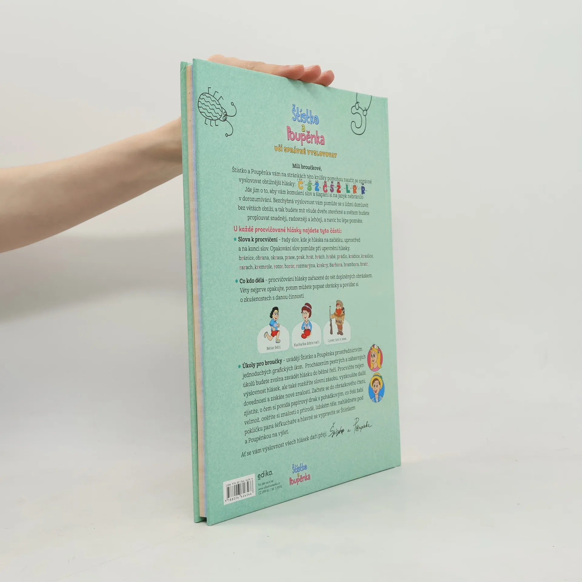 Ahoj broučkové! Naučte se s námi vyslovovat všechny hlásky! Může být procvičování výslovnosti zábava? Může být procvičování výslovnosti zábava? Štístko a Poupěnka vám dokážou, že ano. Spolu s nimi si předškoláci i mladší školáci přečtou pohádku o dracích, naplánují výlet, popovídají si o vaření a zažijí ještě mnohem víc. V jednotlivých kapitolách si posvítí na problematické hlásky a vyzkouší si jejich výslovnost ve slovech i větách. Od lehčích úkolů plynule přejdou k náročnějším – a přitom je s oblíbenou dvojicí čeká spousta legrace!