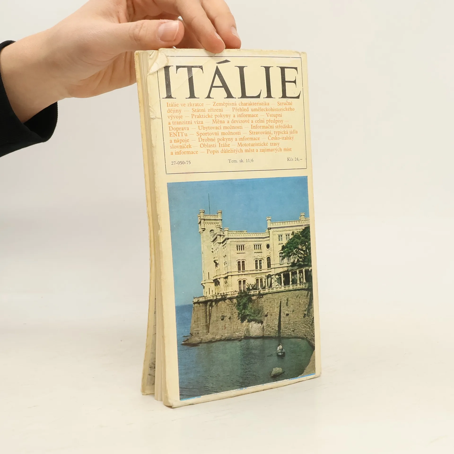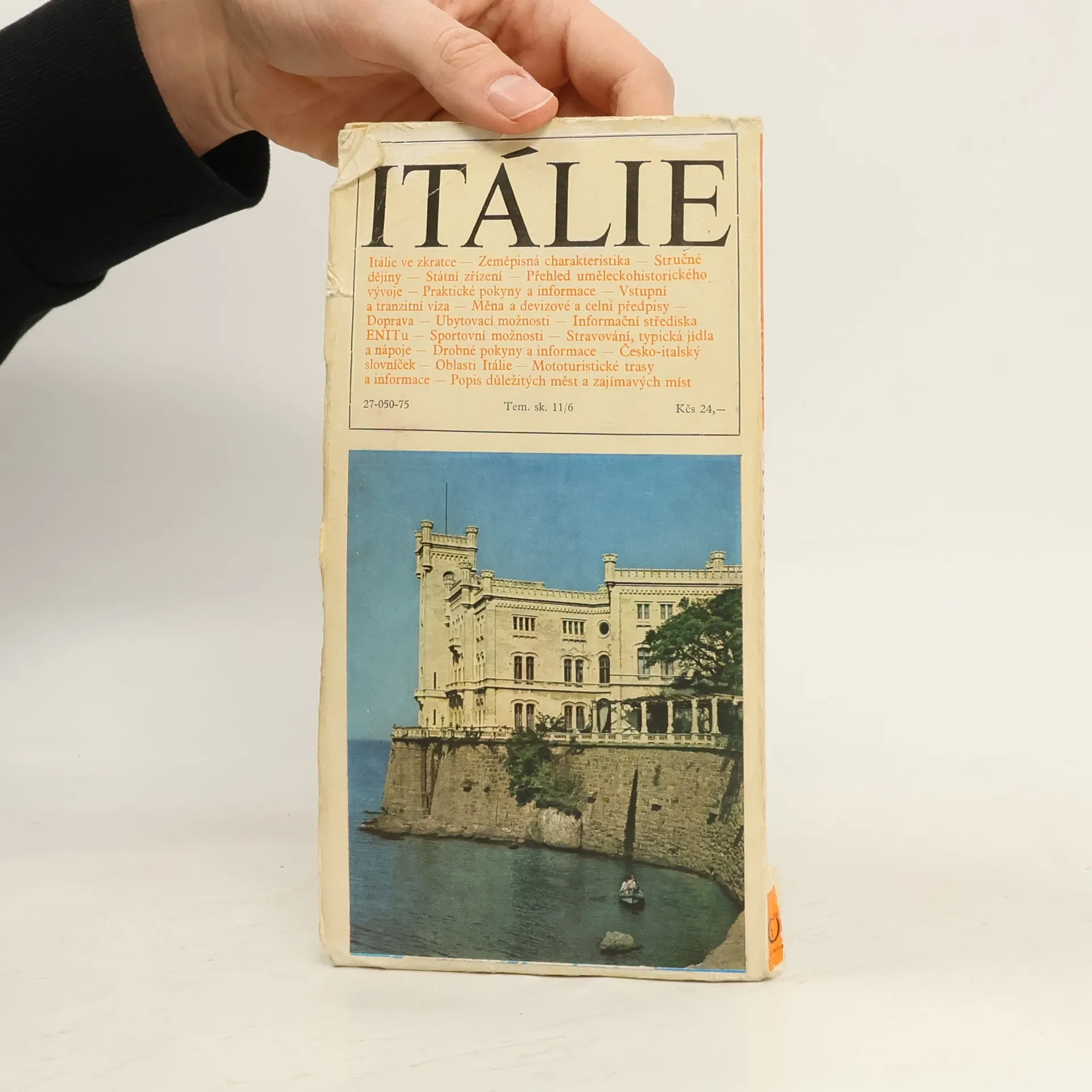 Přináší stručnou zeměpisnou charakteristiku země, jejího státního zřízení, dějin, uměleckohistorického vývoje apod. V další části podává praktické pokyny a informace pro návštěvníky, seznamuje s jednotlivými oblastmi Itálie, mototuristickými trasami a uvádí abecedně uspořádanýpopis důležitých měst a zajímavých míst Itálie.