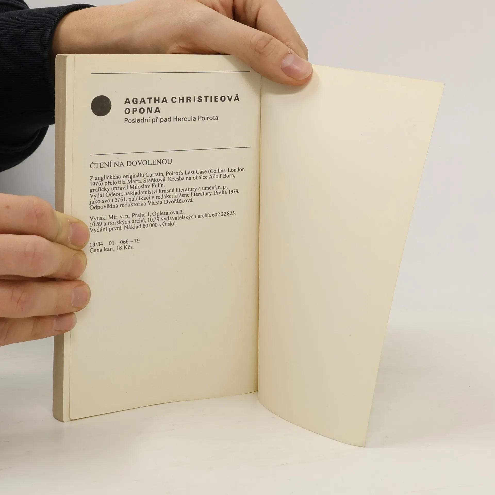 Poslední případ Hercule Poirota. Detektivní román, kterým se anglická autorka navždy rozloučila s oblíbeným literárním hrdinou. V uzavřené skupině lidí dochází k vraždě, která se stane jedním z nejtěžších a nejošidnějších Poirotových případů. Vytuší souvislost se zločinem v minulosti, objeví pachatele a když si uvědomí, že nemá dostatek důkazů pro jeho usvědčení, bere spravedlnost do svých rukou. Shodou okolností se odehrává Poirotův poslední případ na místě, kde začala jeho detektivní dráha. Edice Čtení na dovolenou. 1. vydání.