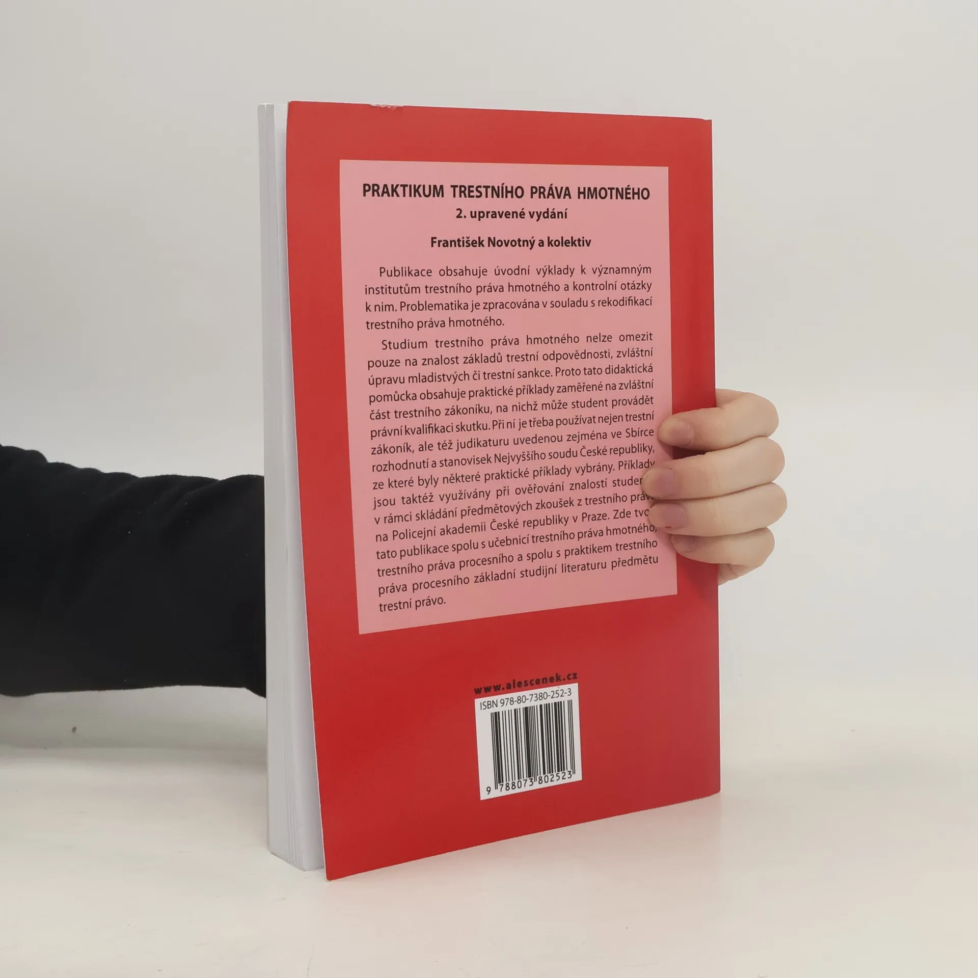 Publikace z hlediska systematického obsahuje úvodní výklady k významným institutům trestního práva hmotného a kontrolní otázky k těmto institutům. Problematika je zpracována v souladu s proběhnuvší rekodifikací trestního práva hmotného. Tato didaktická pomůcka obsahuje praktické příklady, které jsou zaměřené do oblasti zvláštní části trestního zákoníku, na nichž může student provádět právní kvalifikaci skutku. Při právním posuzování příkladů je třeba používat nejen trestní zákoník, ale též judikaturu uvedenou zejména ve Sbírce rozhodnutí a stanovisek Nejvyššího soudu České republiky.