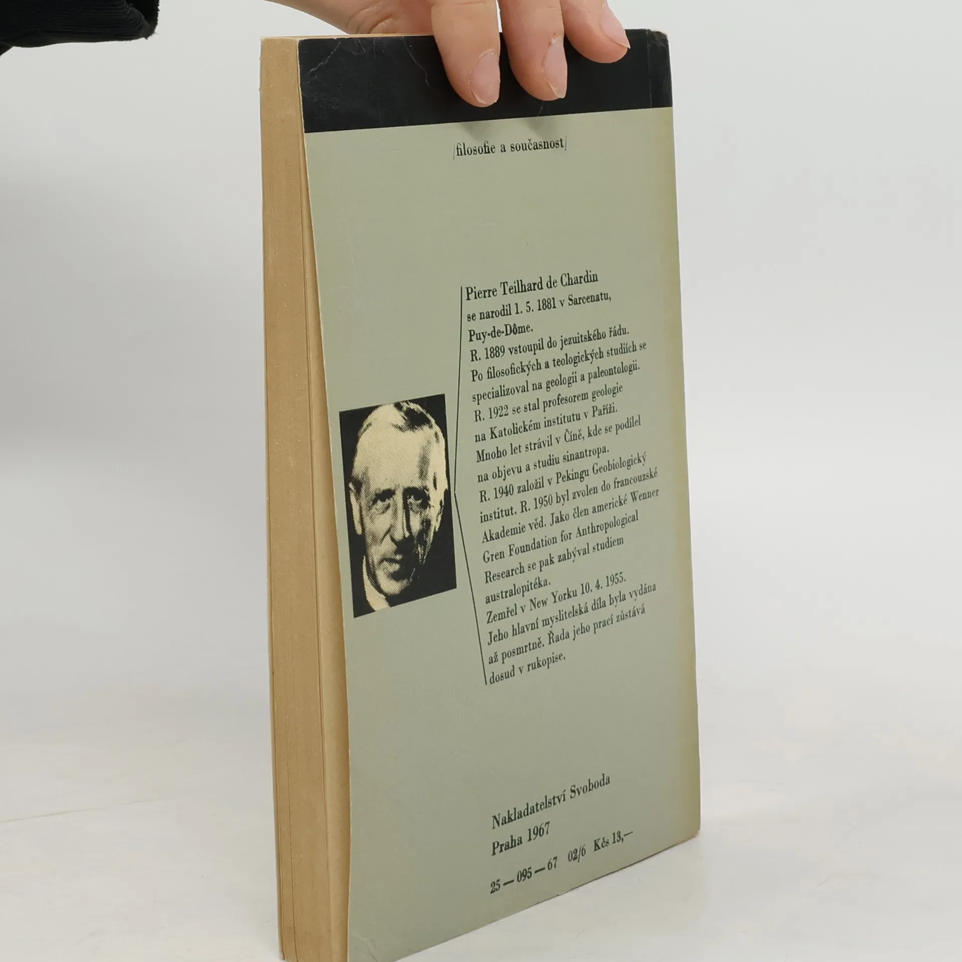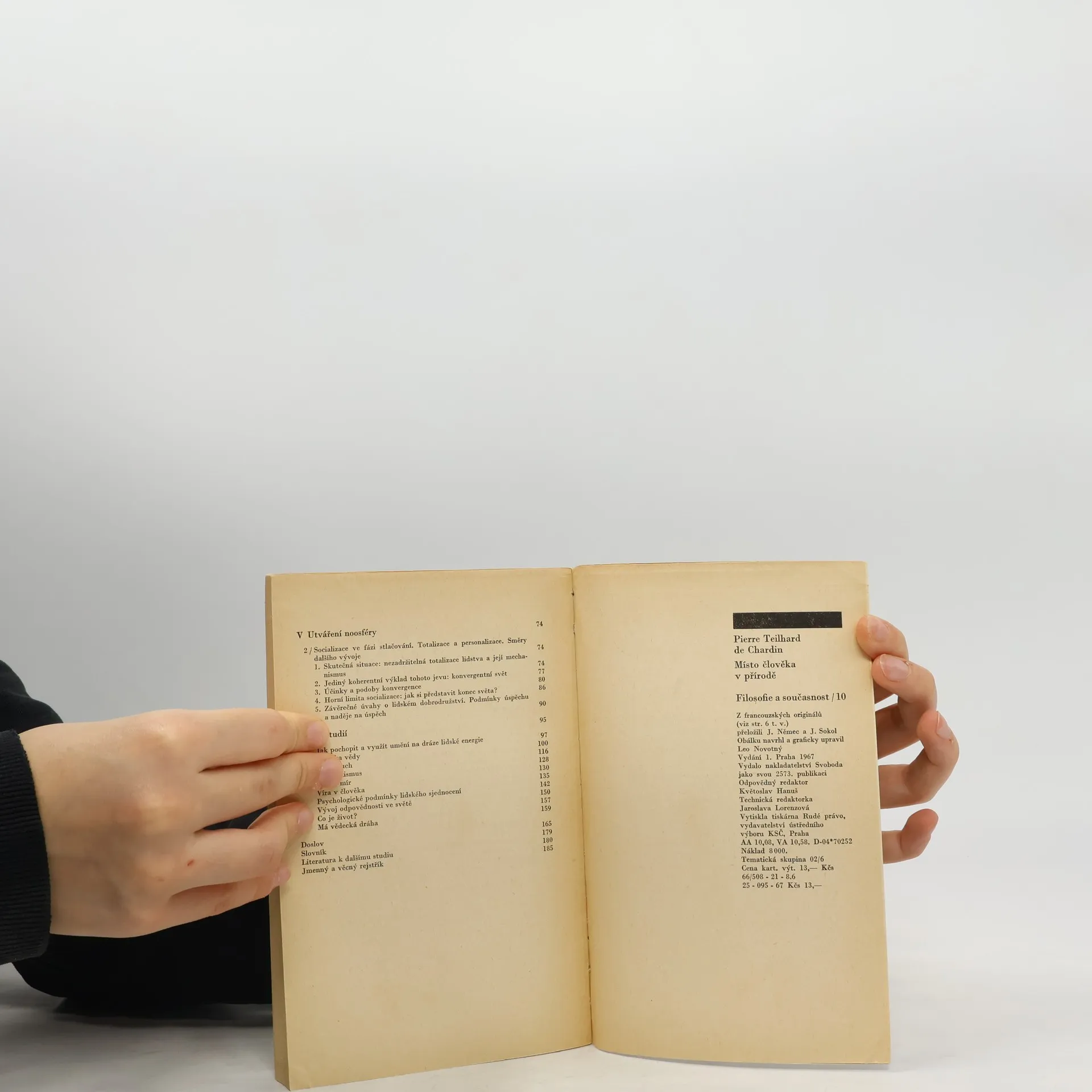 Výbor z díla francouzského katolického filosofa, paleontologa a geologa, představitele „křesťanského evolucionismu“. Kromě práce Místo člověka v přírodě (Lidská zoologická skupina – její struktura a vývojové směry), v níž se soustředuje na problém antropogeneze (I. Místo a významživota ve vesmíru. Spirálovitě se navíjející svět. II. Rozvíjení biosféry a odštěpení antropoidů. III. Příchod člověka, práh reflexe, IV. Utváření noosféry. 1. Socializace ve fázi rozpínání. Civilizace a individuace. V. Utváření noosféry. 2. Socializace ve fázi stlačování. Totalizace a personalizace. Směry dalšího vývoje), zahrnuje i kratší studie z let 1939–1950. Pojednávají o mystice vědy, ekumenismu, víře v mír a v člověka, psychologických podmínkách lidského sjednocení aj.