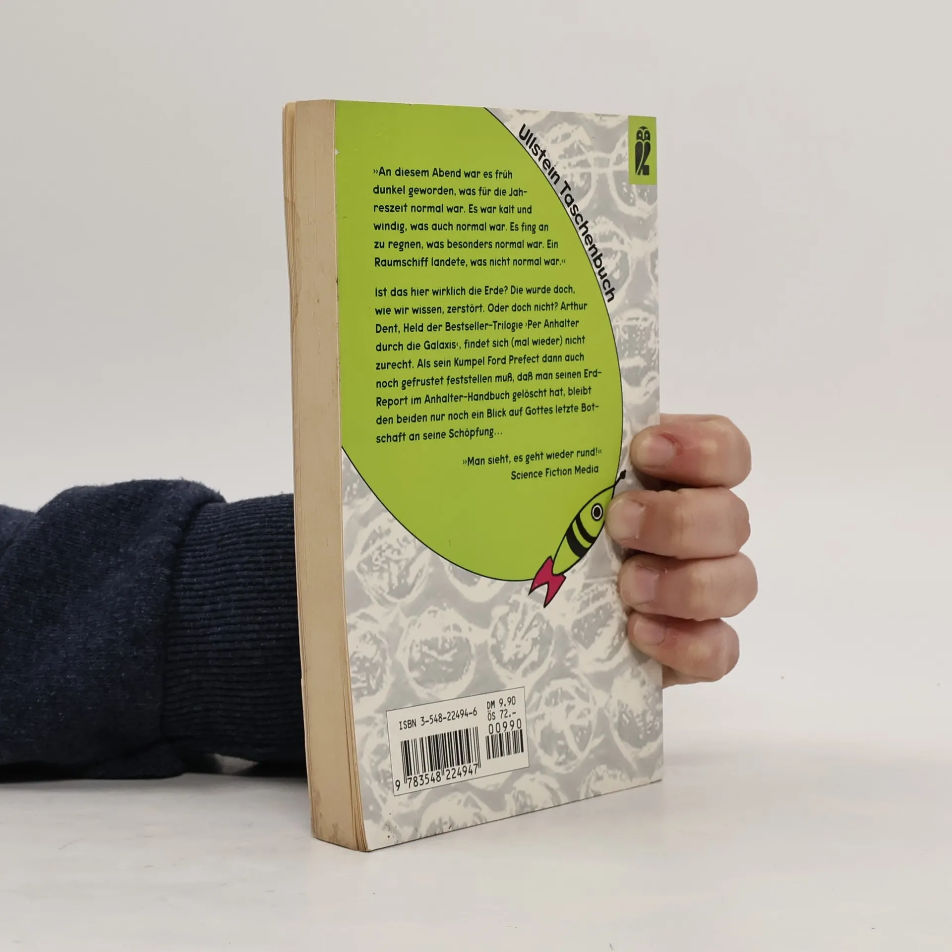 Arthur Dents Flucht von dem absolut unbedeutenden, kleinen blaugrünen Planeten in den unerforschten Einöden des total aus der Mode gekommenen Ausläufers des westlichen Spiralarms der Galaxis nimmt kein Ende. Im vierten Band der Hitchhiker -Trilogie kehrt der müde Wanderer durch die Weiten des Weltenraumes auf die Erde zurück. Sie wurde wohl doch nicht gesprengt. Oder doch? Arthur Dents Porsche mit dem Aufkleber "Mein Zweitwagen ist auch ein Porsche" steht jedenfalls noch vor der Kneipe Horse and Groom, wo damals alles begann, genauso wie die aus Pappe gestanzten Mädchen, die stapelweise Erdnußpäckchen auf ihren Brüsten balancieren. Sogar sein Haus ist noch da. Alles ist genau so, wie er es zurückgelassen hatte -- außer der Schachtel neben dem schäbigen alten Fernseher. Darinnen findet sich ein Goldfischglas mit den zierlich eingravierten Buchstaben, die ein "Mach's gut, und danke..." ergeben. Ist Arthur Dent wirklich auf der Erde gelandet? Was ist aus all den Delphinen geworden? Was passierte wirklich an jenem Tag, dessen Ereignisse Arthur vor acht seiner persönlichen Jahre so viele Scherereien gebracht hatten? Fragen über Fragen, die die deutsche Hitchhiker -Fangemeinde beunruhigen. Aber keine Panik, der Übersetzer dieser Ausgabe ist ganz offensichtlich ein guter Übersetzer. Ihm ist die Aufgabe so vortrefflich gelungen, daß das Buch zu einer Tüte Kartoffelchips wird. Man hört erst auf, wenn es alle ist.