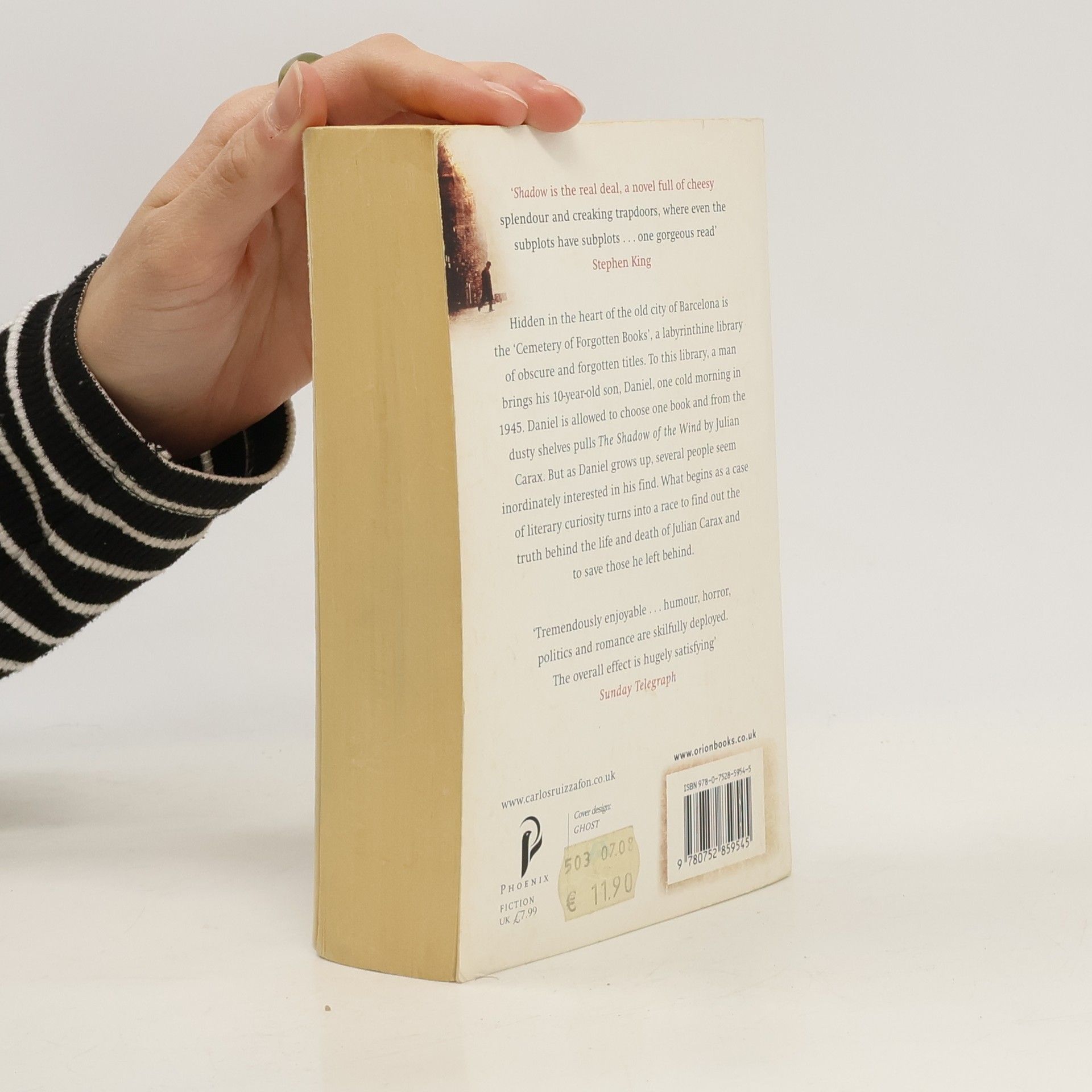 Hidden in the heart of the old city of Barcelona is the 'cemetery of lost books', a labyrinthine library of obscure and forgotten titles that have long gone out of print. To this library, a man brings his 10-year-old son Daniel one cold morning in 1945. Daniel is allowed to choose one book from the shelves and pulls out 'La Sombra del Viento' by Julian Carax. But as he grows up, several people seem inordinately interested in his find. Then, one night, as he is wandering the old streets once more, Daniel is approached by a figure who reminds him of a character from La Sombra del Viento, a character who turns out to be the devil. This man is tracking down every last copy of Carax's work in order to burn them. What begins as a case of literary curiosity turns into a race to find out the truth behind the life and death of Julian Carax and to save those he left behind. A page-turning exploration of obsession in literature and love, and the places that obsession can lead.