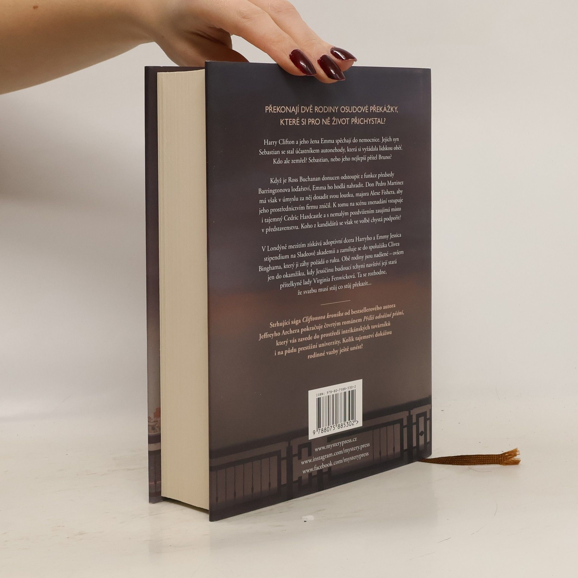 PŘEKONAJÍ DVĚ RODINY OSUDOVÉ PŘEKÁŽKY, KTERÉ SI PRO NĚ ŽIVOT PŘICHYSTAL? Harry Clifton a jeho žena Emma spěchají do nemocnice. Jejich syn Sebastian se stal účastníkem autonehody, která si vyžádala lidskou oběť. Kdo ale zemřel? Sebastian, nebo jeho nejlepší přítel Bruno? Když je Ross Buchanan donucen odstoupit z funkce předsedy Barringtonova loďařství, Emma ho hodlá nahradit. Don Pedro Martinez má však v úmyslu za něj dosadit svou loutku, majora Alexe Fishera, aby jeho prostřednictvím firmu zničil. K tomu na scénu znenadání vstupuje i tajemný Cedric Hardcastle a s nemalým pozdvižením zaujímá místo v představenstvu. Koho z kandidátů se však ve volbě chystá podpořit? V Londýně mezitím získává adoptivní dcera Harryho a Emmy Jessica stipendium na Sladeově akademii a zamiluje se do spolužáka Clivea Binghama, který ji záhy požádá o ruku. Obě rodiny jsou nadšené – ovšem jen do okamžiku, kdy Jessičinu budoucí tchyni navštíví její stará přítelkyně lady Virginia Fenwicková. Ta se rozhodne, že svatbu musí stůj co stůj překazit... ____ Strhující sága Cliftonova kronika od bestsellerového autora Jeffreyho Archera pokračuje čtvrtým románem Příliš odvážné přání, který vás zavede do prostředí intrikánských továrníků i na půdu prestižní univerzity. Kolik tajemství dokážou rodinné vazby ještě unést?