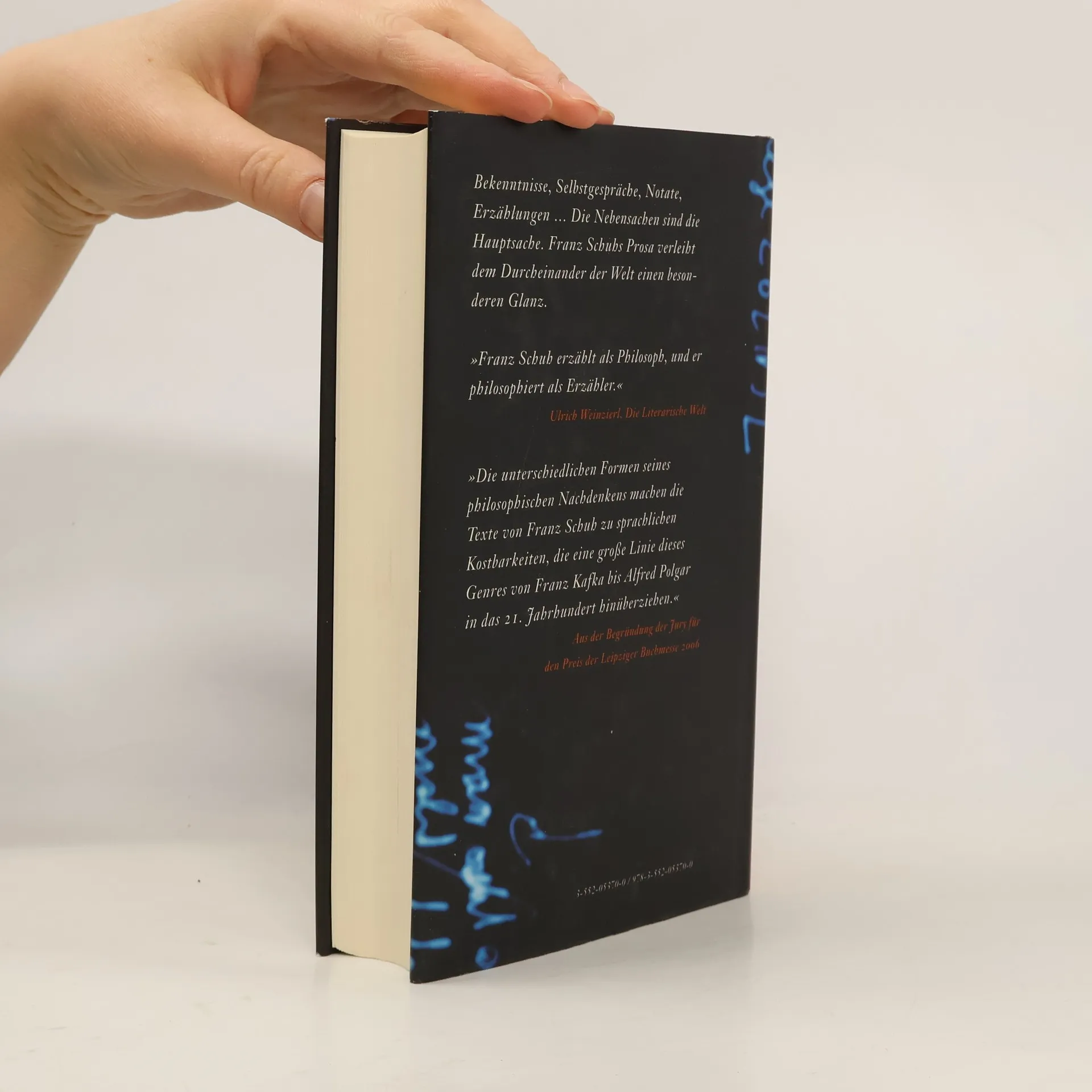 Franz Schuh ist Essayist, Philosoph und glänzender Interpret eigener Texte. Er gehört zu den wichtigsten österreichischen Schriftstellern. Nach einer Hand voll Büchern, darunter ein Wien-Roman und Aufsätze zur Literatur, erscheint nun, was Franz Schuh als sein Hauptwerk bezeichnet: „Schwere Vorwürfe, schmutzige Wäsche“ besteht aus einem bunten Gemisch von Selbstgesprächen, Erzählungen, Notaten und dokumentarischen Skizzen, von echten und fingierten Bekenntnissen, von phantasierten Visionen und skurrilen bis rührenden Reflexionen über Liebe, Glück und Sinnlosigkeit. Franz Schuhs Aufzeichnungen sind euphorisch-melancholische Grenzgänge, die das Durcheinander der Welt nicht beseitigen, sondern ihm auf einzigartige Weise Glanz verleihen.
