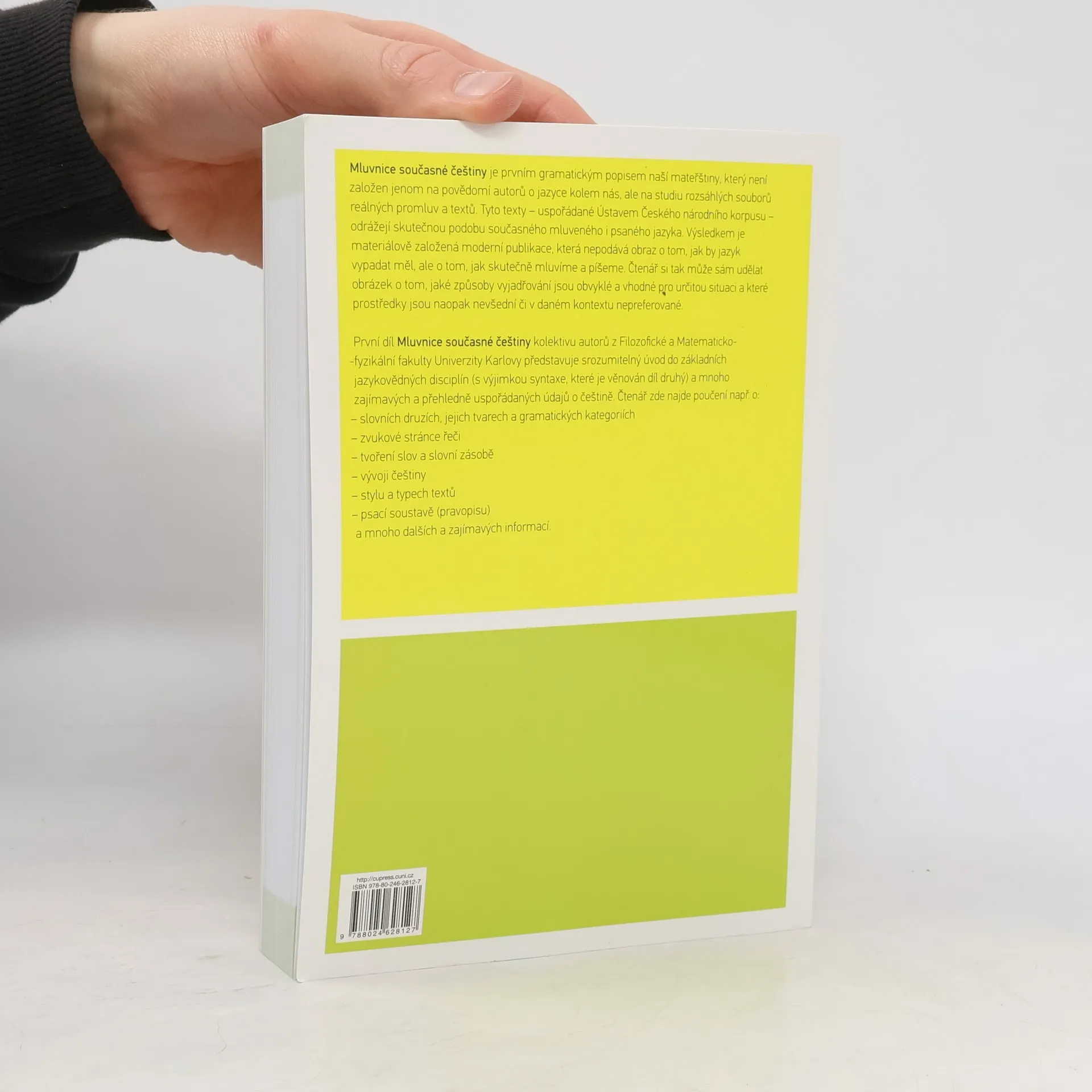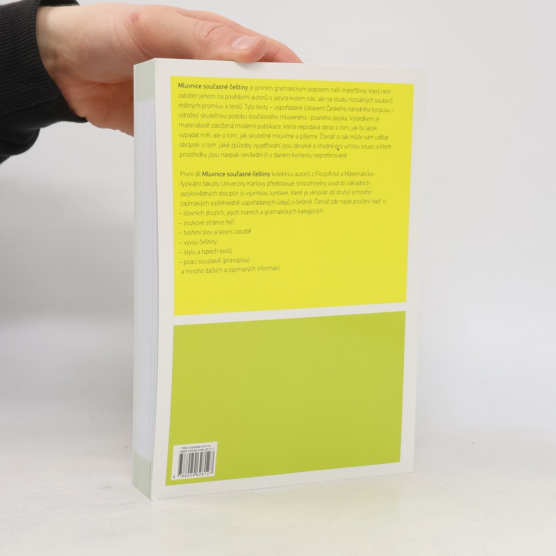Předkládaná Mluvnice současné češtiny autorů působících na různých ústavech Univerzity Karlovy je po téměř patnácti letech novým pokusem o stručný a srozumitelný popis našeho mateřského jazyka. Mluvnice je koncipována jako dvoudílná, přičemž první díl zahrnuje poučení mj. o zvukové stránce jazyka, slovní zásobě, slovotvorbě, tvarosloví, stylistice a psací soustavě (druhý díl pak bude věnován větné skladbě). Jako vůbec první popis svého druhu se mluvnice pokouší systematicky zachycovat rozdíl mezi mluvenou a psanou češtinou, a to na základě rozsáhlých dat z Českého národního korpusu (www.korpus.cz). Výsledkem je materiálově založená moderní publikace, která nepodává obraz o tom, jak by jazyk vypadat měl, ale o tom, jak skutečně mluvíme a píšeme. Čtenář si tak může sám udělat obrázek o tom, jaké způsoby vyjadřování jsou obvyklé a vhodné pro určitou situaci a které prostředky jsou naopak nevšední či v daném kontextu nepreferované.